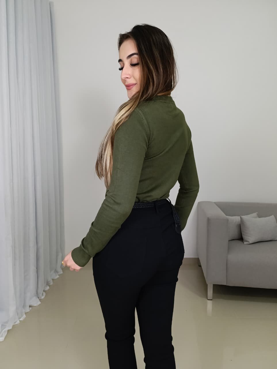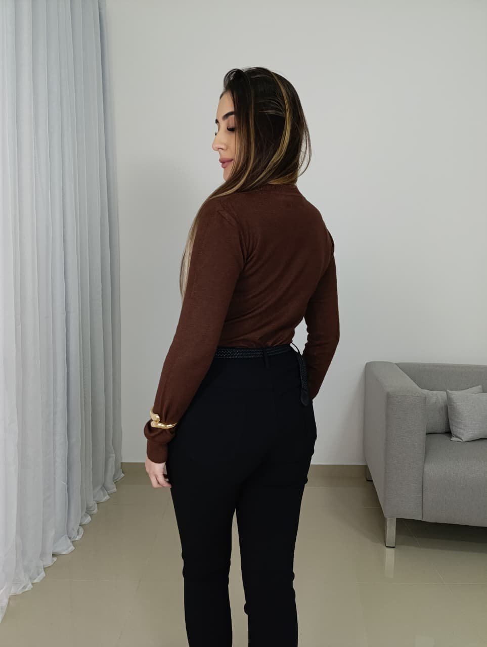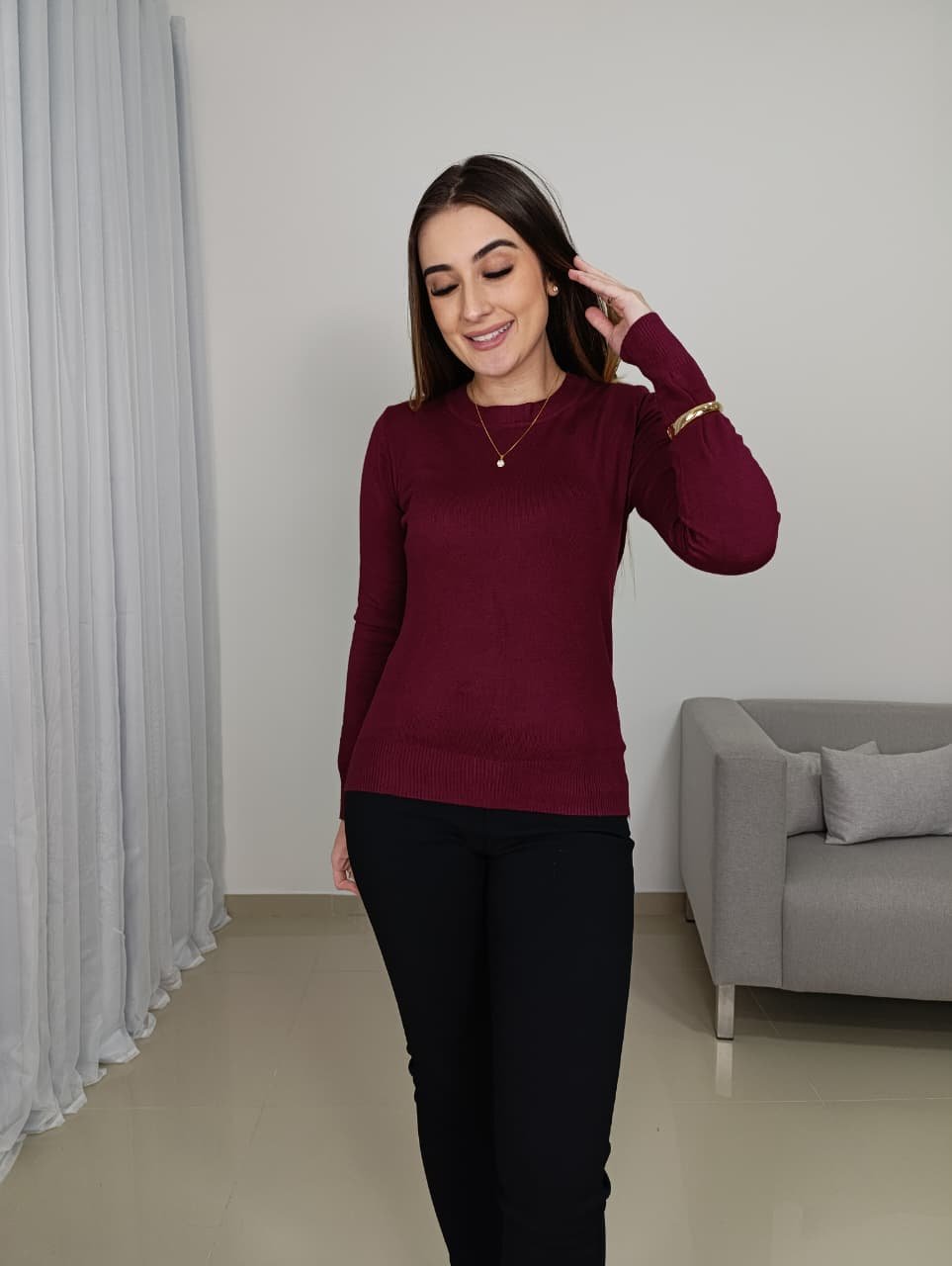 A modelagem slim valoriza a silhueta de forma elegante, deixando o visual alinhado e moderno. A gola redonda clássica traz versatilidade, permitindo composições tanto casuais quanto mais sofisticadas. As mangas longas ajustadas acompanham o desenho do corpo, tornando a peça ideal para usar sozinha ou como base para sobreposições com blazers, jaquetas, coletes ou casacos.