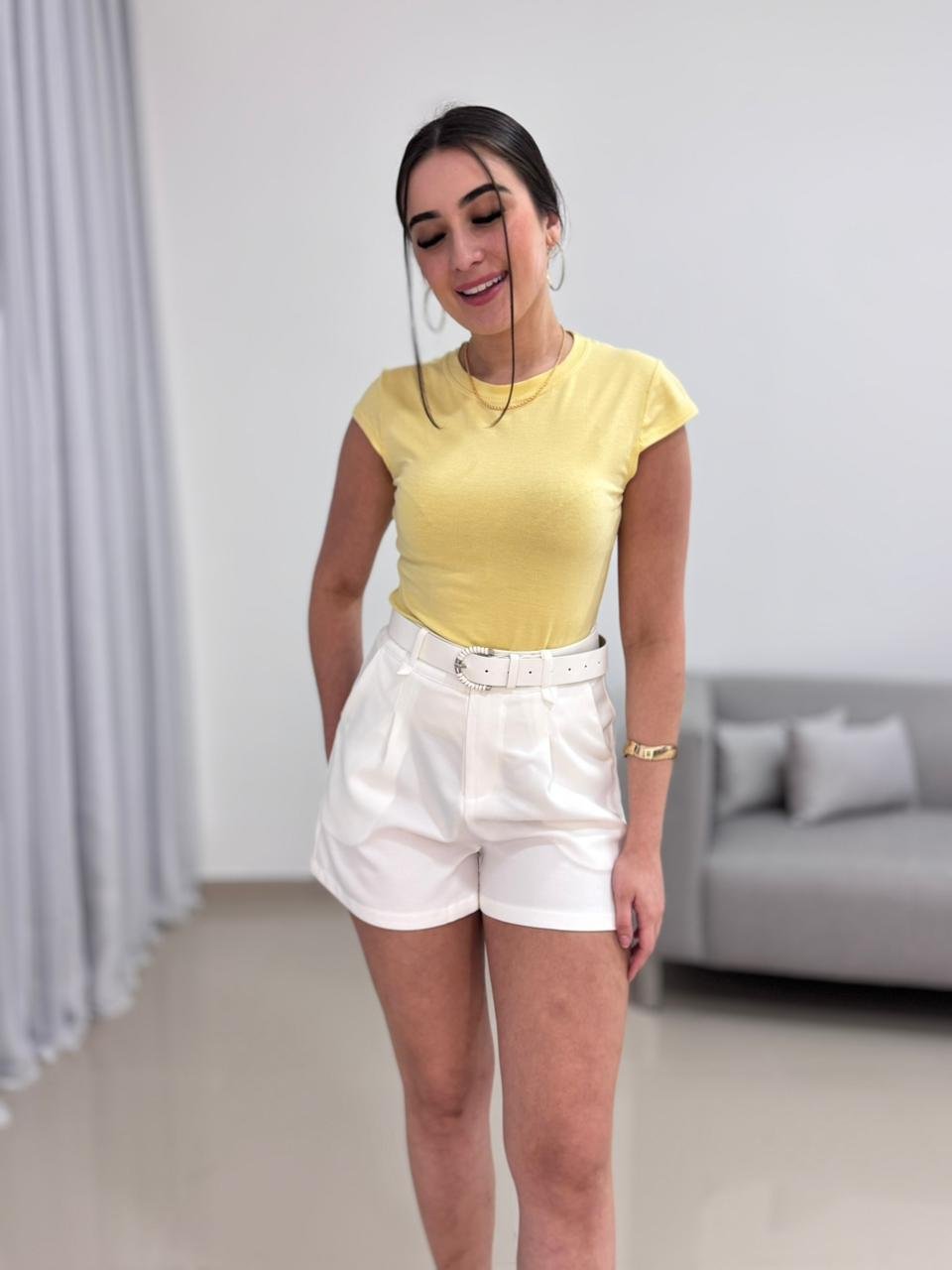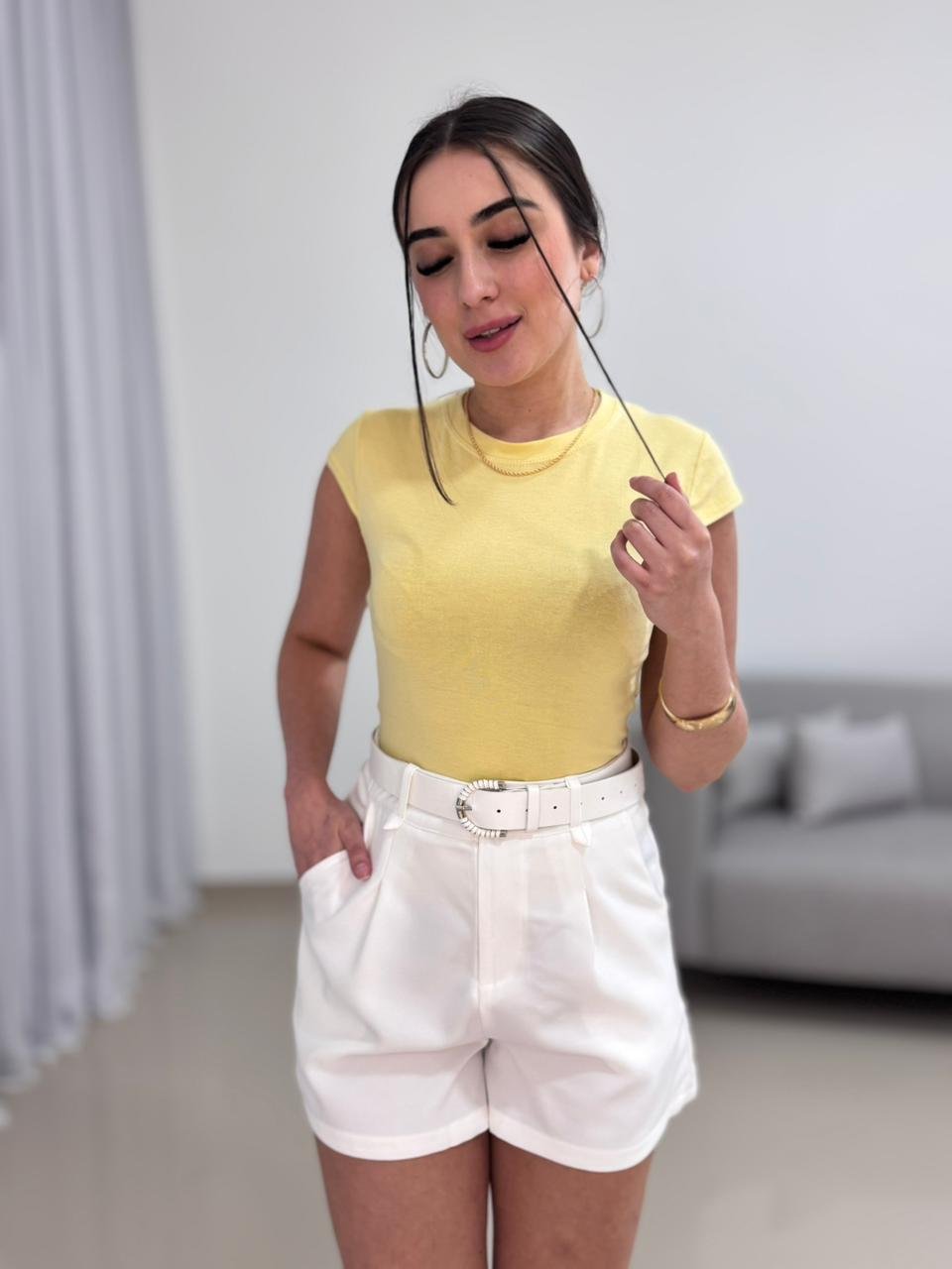 Nas fotos, a blusinha aparece combinada com short branco de cintura alta, mostrando como a peça valoriza o corpo e cria produções frescas e elegantes. Ela combina facilmente com jeans, alfaiataria, shorts, saias ou até por baixo de blazers e jaquetas, sendo uma excelente escolha tanto para o uso diário quanto para looks mais arrumados.