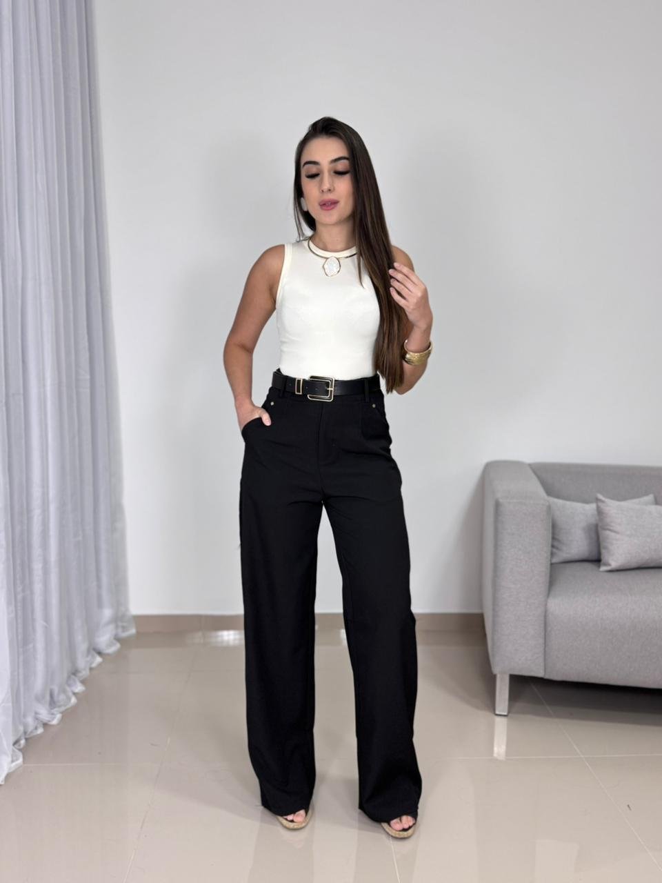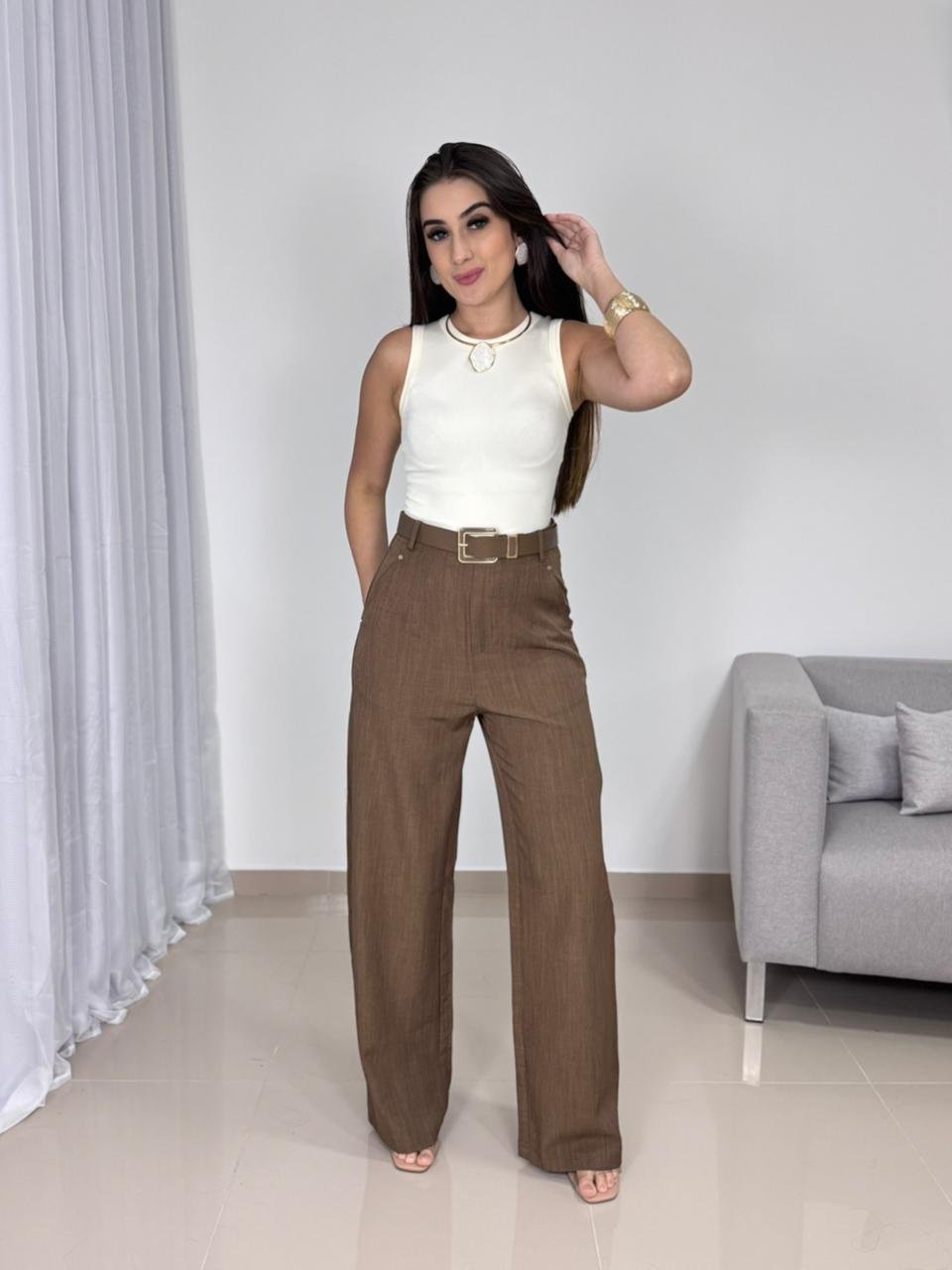 Versátil, essa calça transita facilmente entre produções formais e casuais chic. Combine com camisas e blusas mais ajustadas para ambientes profissionais, ou aposte em regatas, croppeds e sandálias para looks modernos e contemporâneos. As cores neutras permitem inúmeras combinações, tornando a peça indispensável no guarda-roupa feminino.