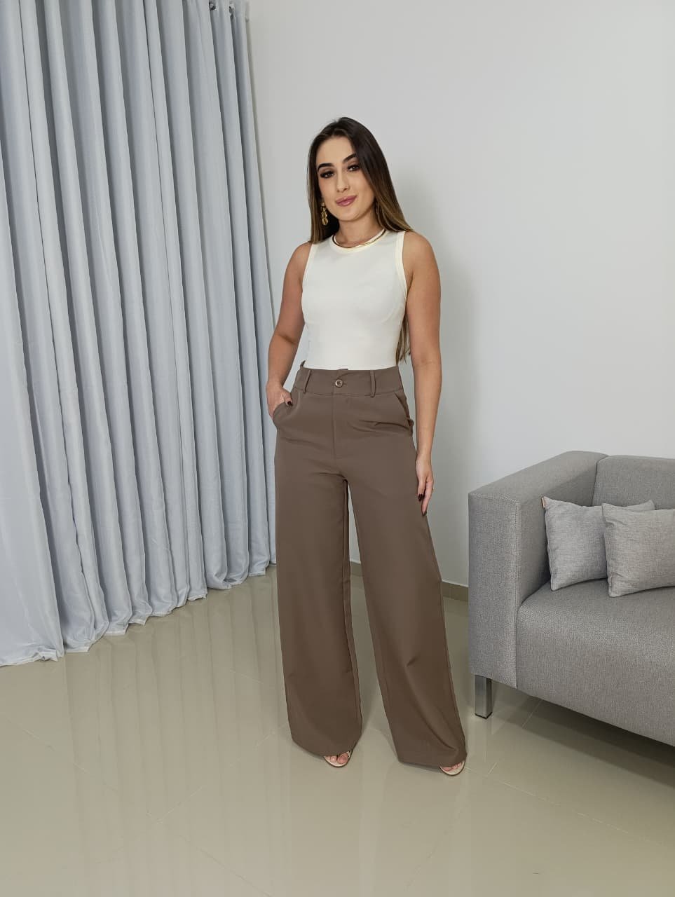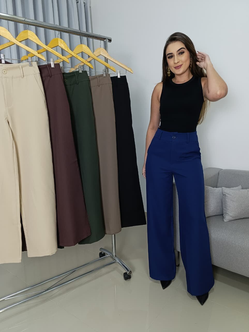 A versatilidade é um dos maiores diferenciais dessa calça. Ela pode ser combinada facilmente com blusas básicas, camisas sociais, croppeds, blazers ou tricots. Com salto alto, cria um look sofisticado e alongado; com tênis ou sandálias, traz uma proposta moderna e casual chic.