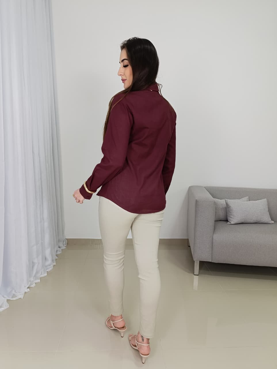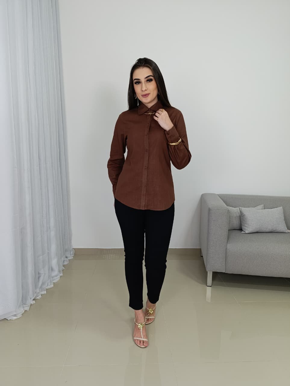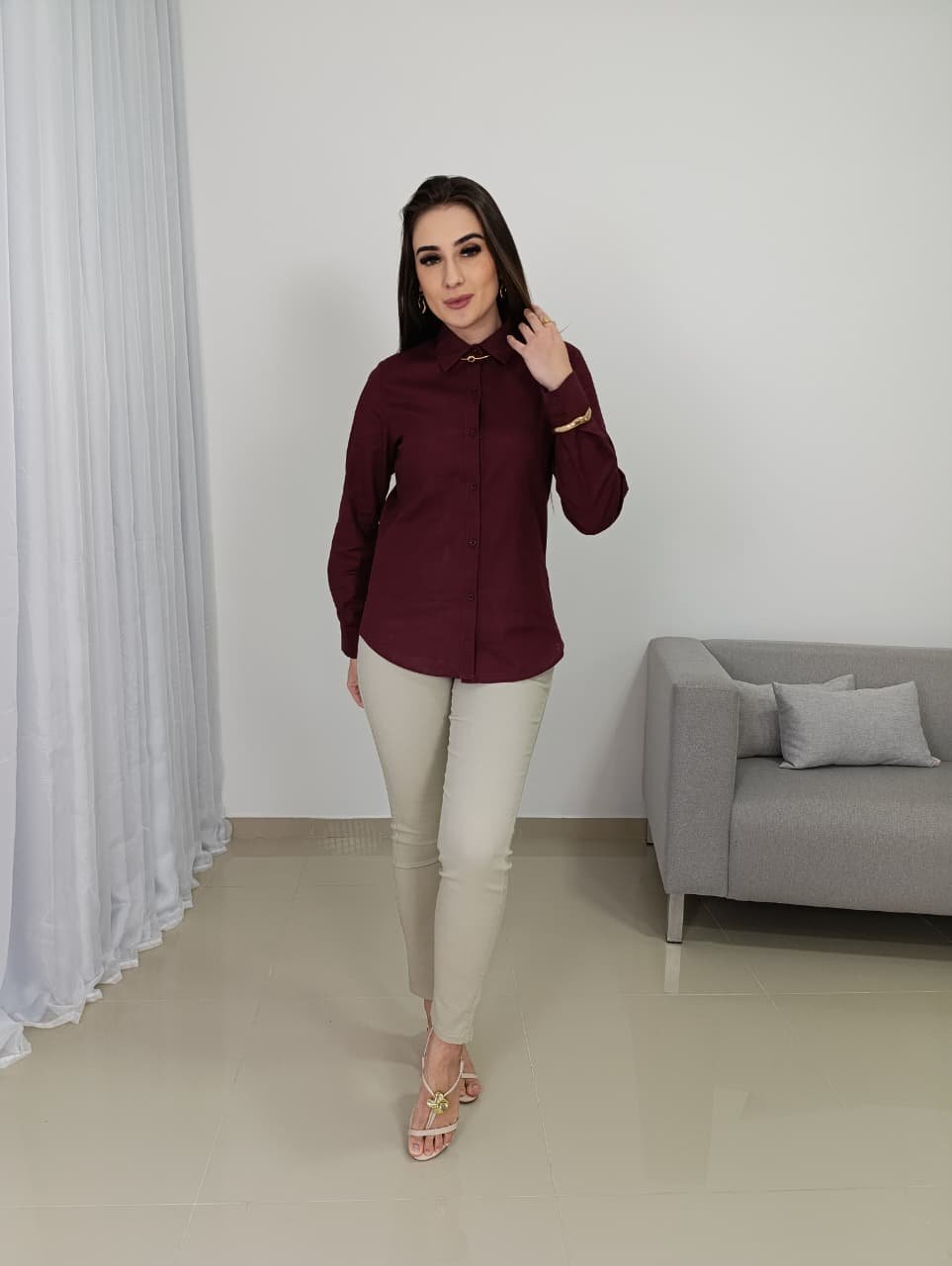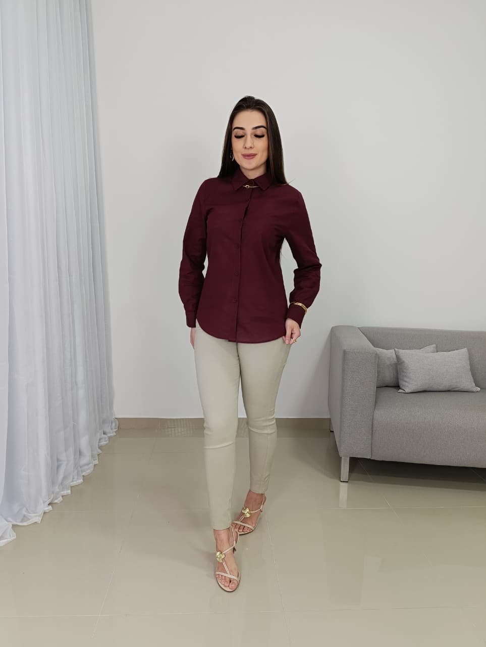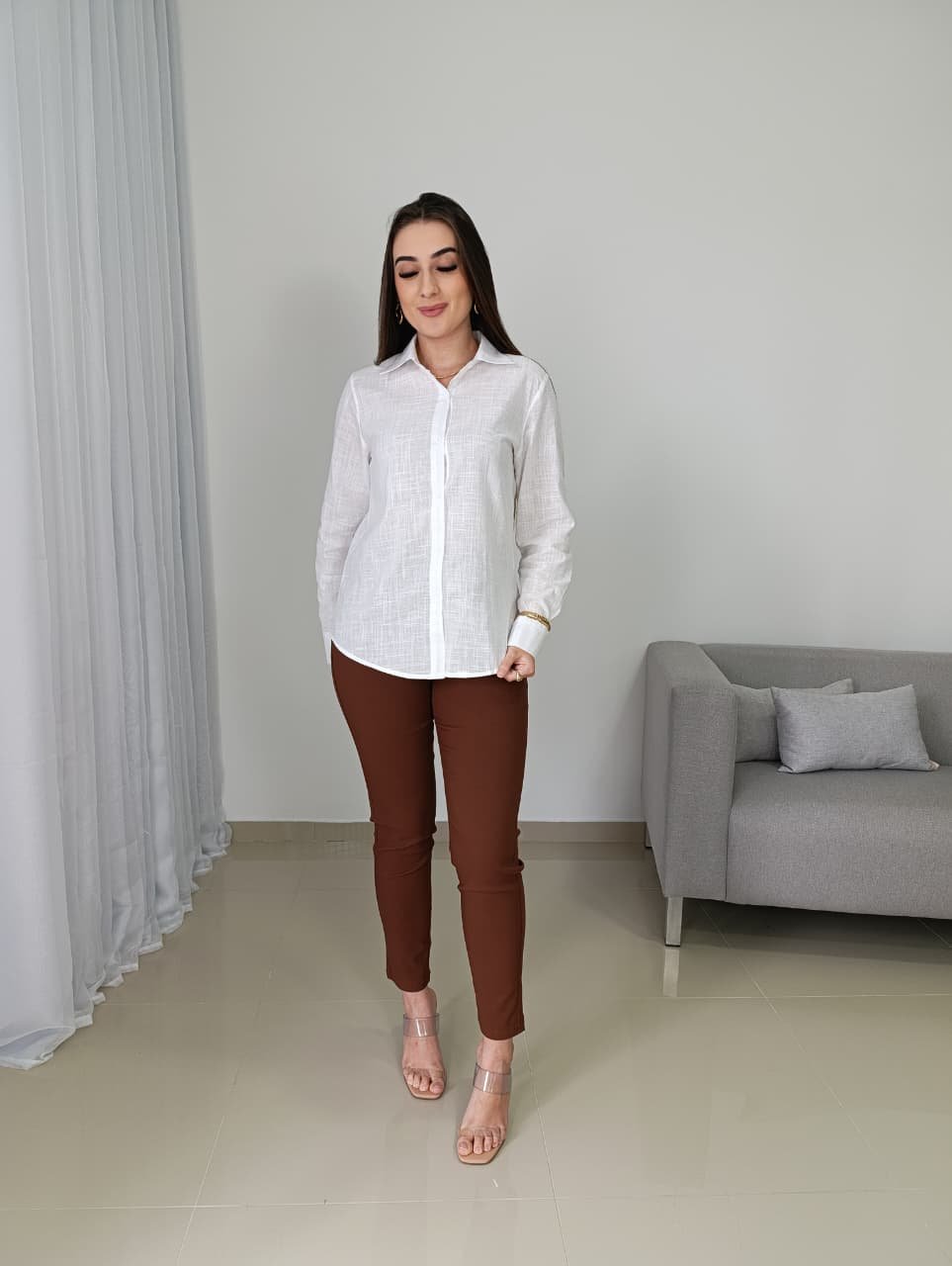 Camisa de Linho Slim Feminina une tecido leve, modelagem ajustada e design clássico, garantindo elegância e conforto em qualquer ocasião.