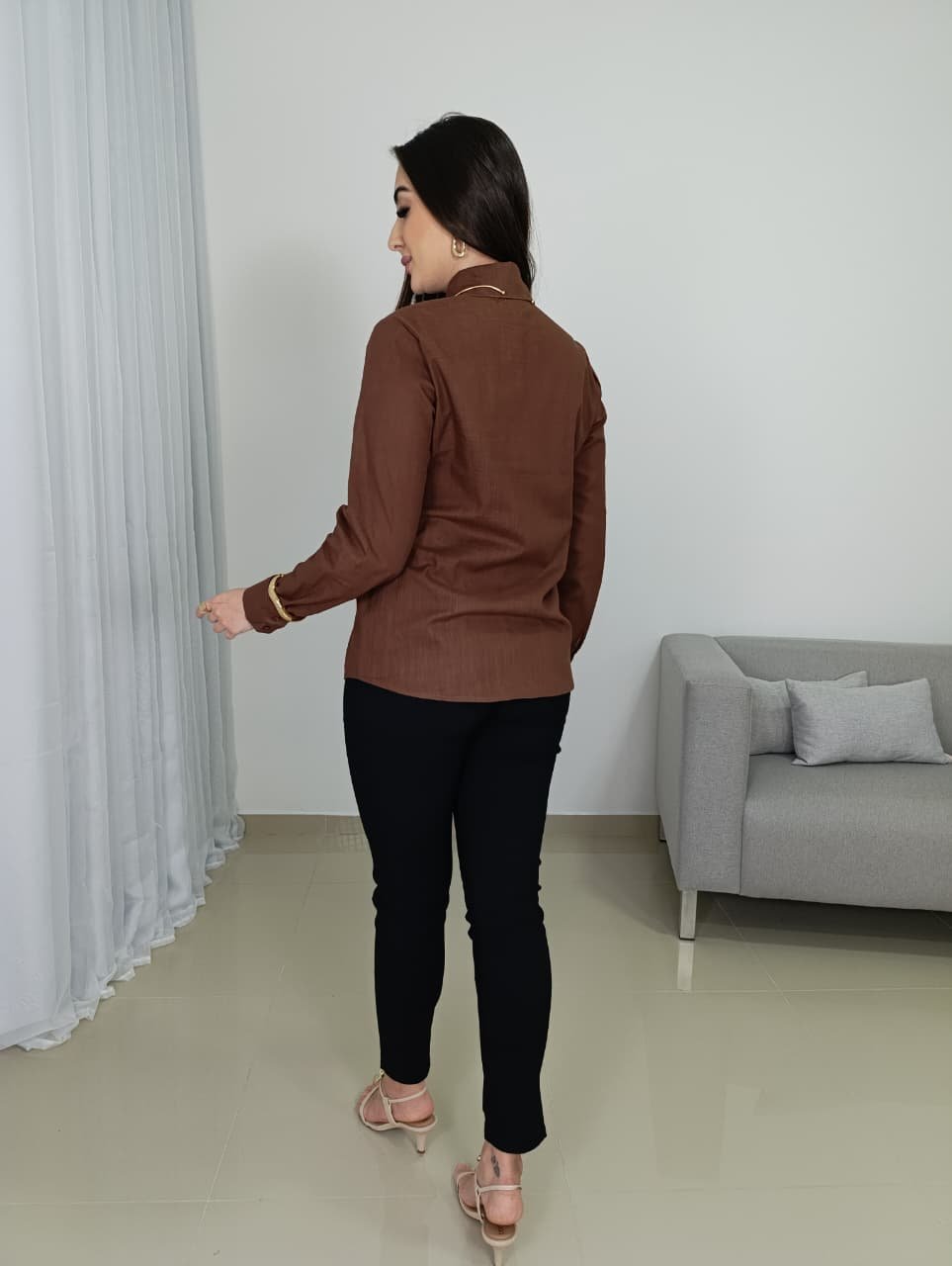 A modelagem slim proporciona um caimento ajustado ao corpo, valorizando a silhueta sem apertar. Os botões frontais e a gola clássica tornam a peça extremamente versátil, permitindo o uso tanto fechada quanto levemente aberta, criando propostas que vão do casual chic ao look social moderno. As mangas longas completam o design com elegância, possibilitando diferentes formas de uso, inclusive dobradas para um visual mais despojado.