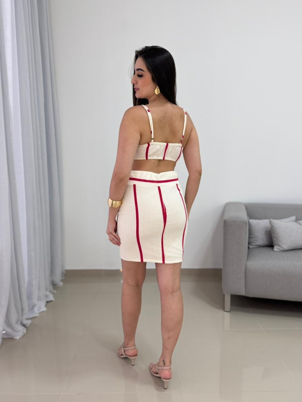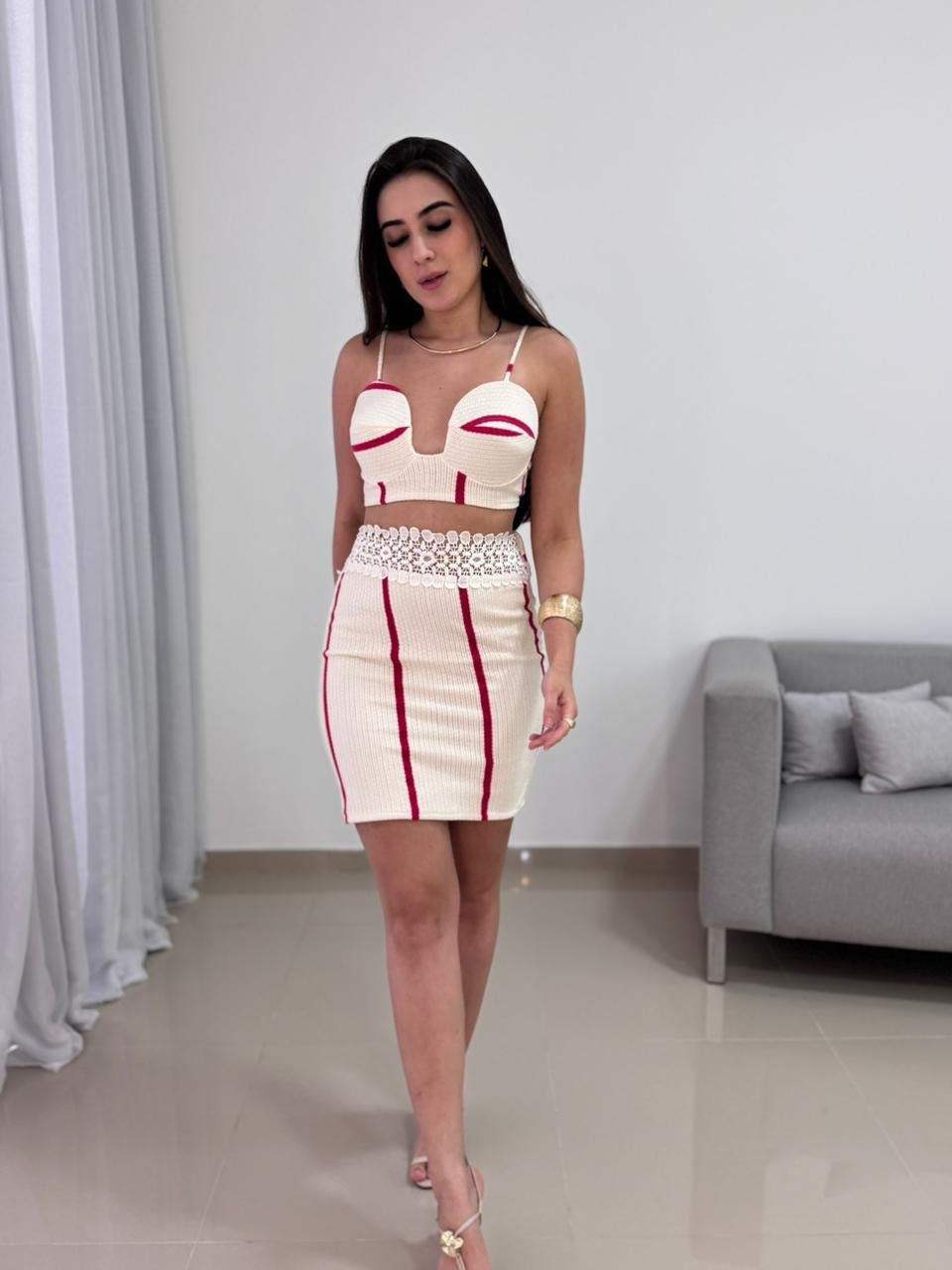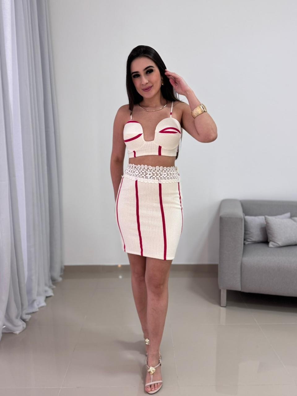 O cropped conta com alças finas e busto estruturado, que oferece sustentação e valoriza o colo com elegância. Os detalhes em vermelho criam um contraste marcante sobre o fundo off-white, trazendo personalidade e um visual contemporâneo à peça. A saia possui modelagem ajustada, com cintura bem definida e detalhe em renda delicada no cós, que adiciona charme e feminilidade ao conjunto.