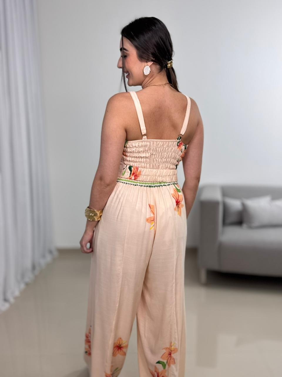 O macacão possui bojo embutido, proporcionando sustentação e segurança ao busto, além de garantir um acabamento mais alinhado ao corpo, dispensando o uso de sutiã. O decote em V valoriza o colo de forma delicada e feminina, ajudando a alongar visualmente a silhueta. As alças ajustáveis permitem melhor adaptação ao corpo, garantindo conforto durante o uso.