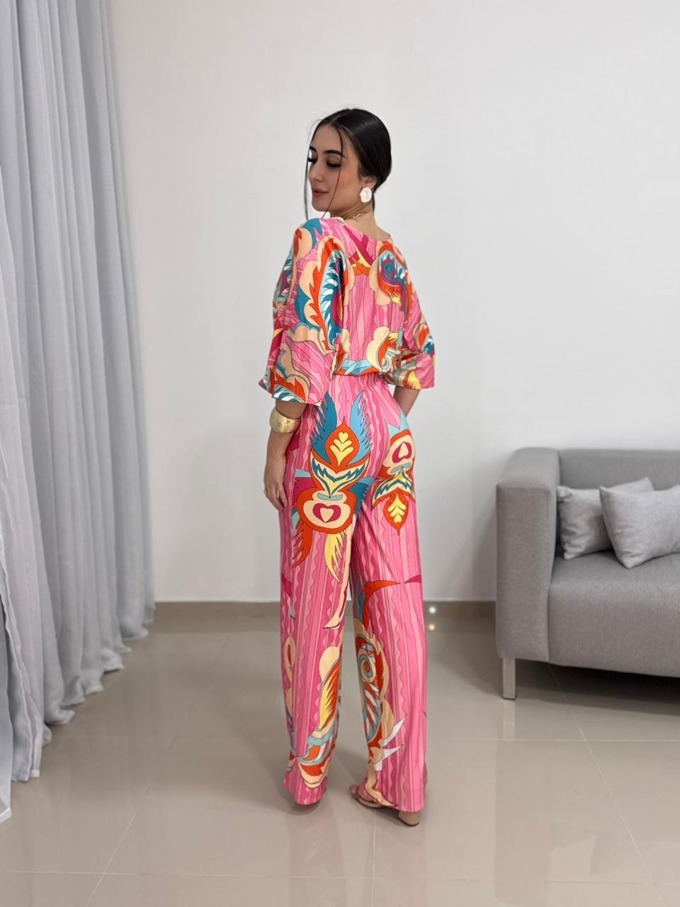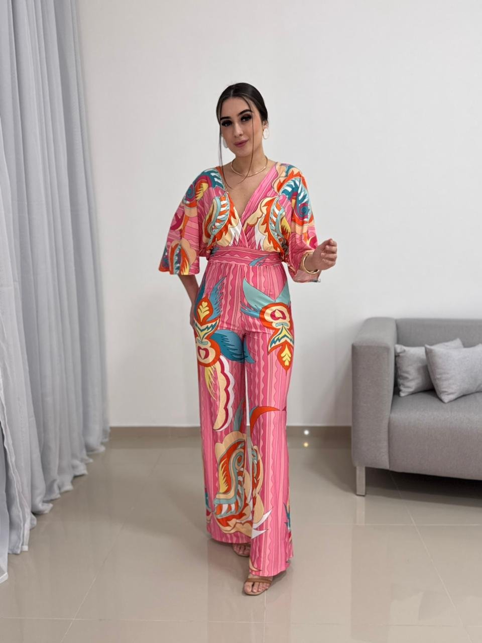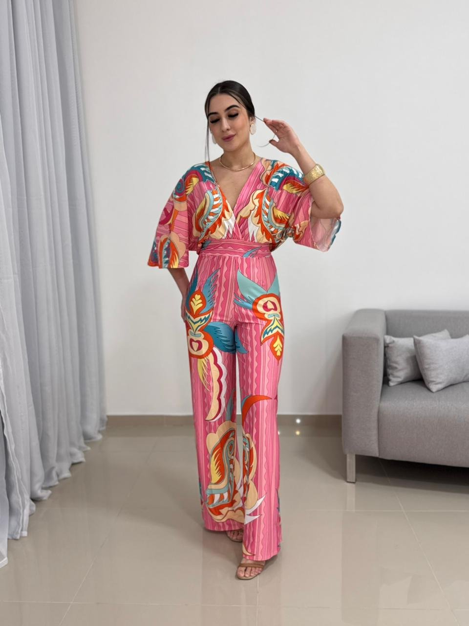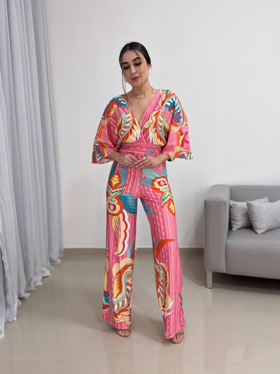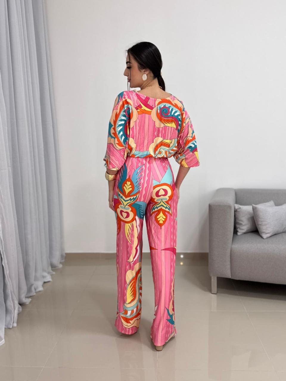 A modelagem valoriza o corpo de forma elegante, com caimento fluido que alonga a silhueta. O decote transpassado em V cria um visual feminino e equilibrado, enquanto a cintura marcada ajuda a definir o shape sem apertar. As mangas amplas adicionam movimento e charme à peça, além de garantirem conforto e liberdade nos movimentos. A calça de corte reto complementa o visual com elegância e versatilidade.