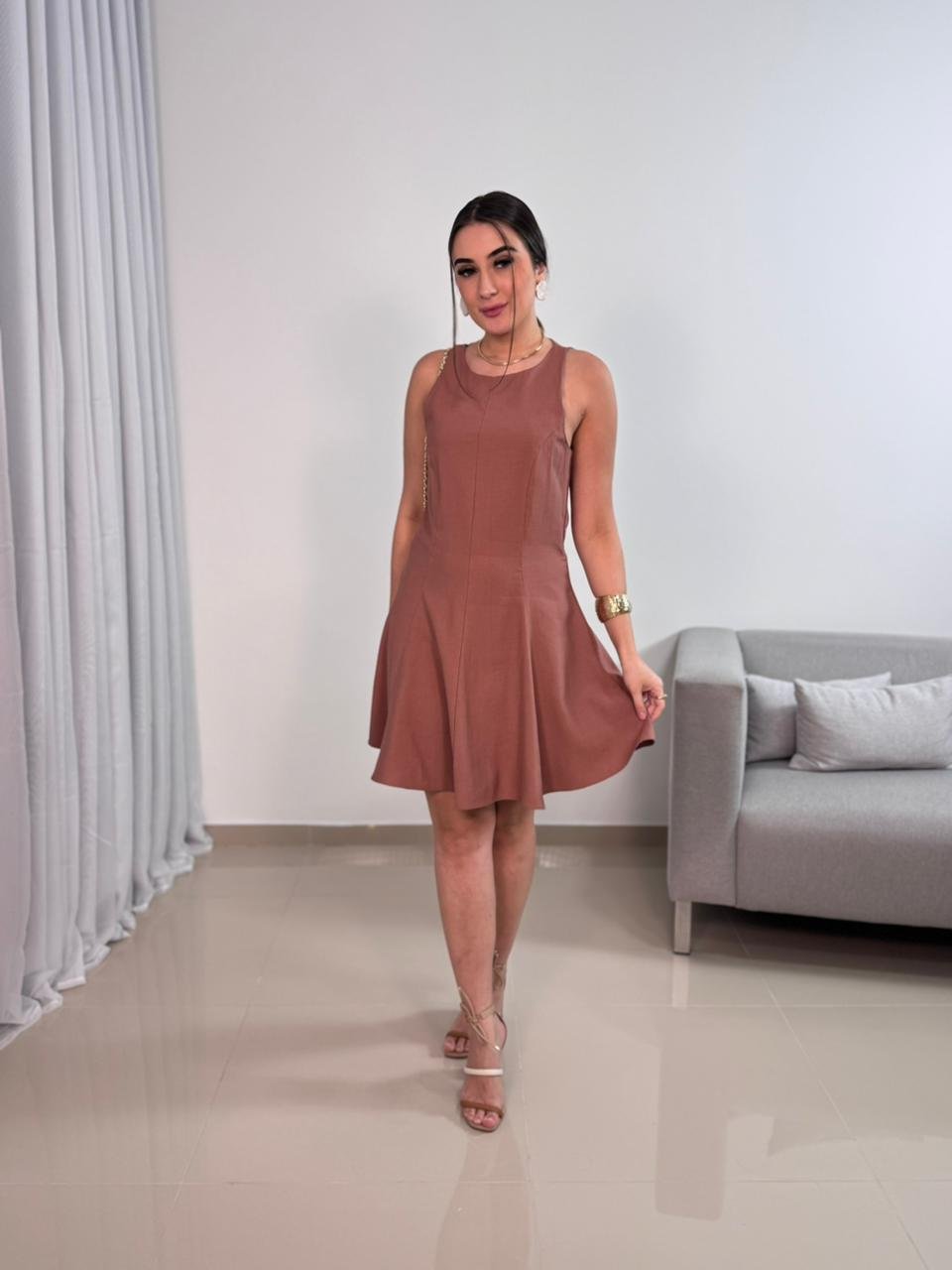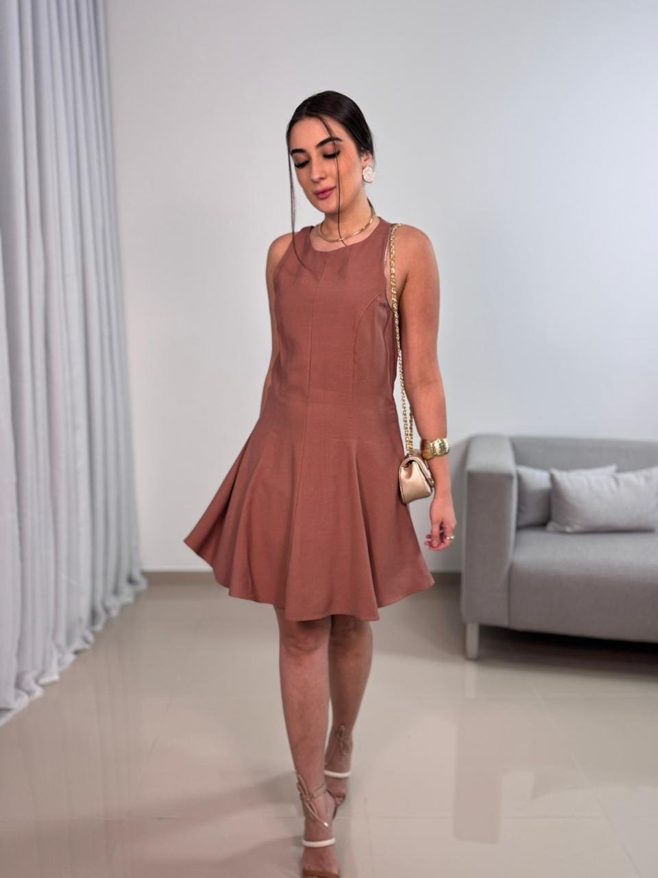 O modelo apresenta decote fechado e corte sem mangas, criando uma proposta moderna, limpa e extremamente versátil. A modelagem é levemente acinturada, valorizando a silhueta de forma natural, sem marcar o corpo. O comprimento curto com a saia fluida garante leveza ao caminhar e um caimento impecável, conforme demonstrado nas fotos.