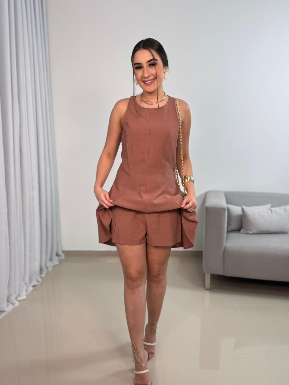 Macaquinho Marrom em Tecido Sensorial com saia sobreposta, que entrega visual elegante de vestido aliado ao conforto e praticidade do short interno.