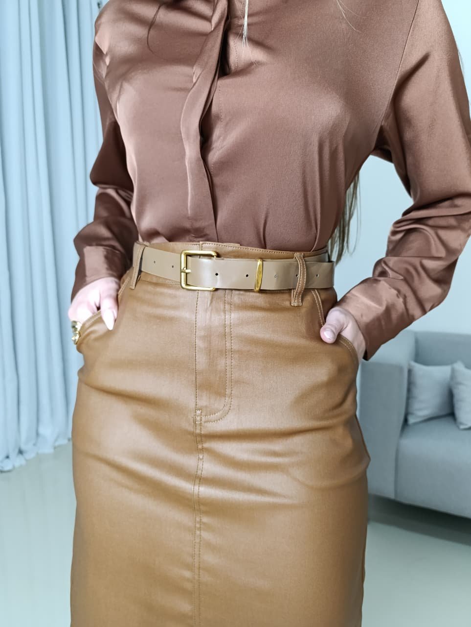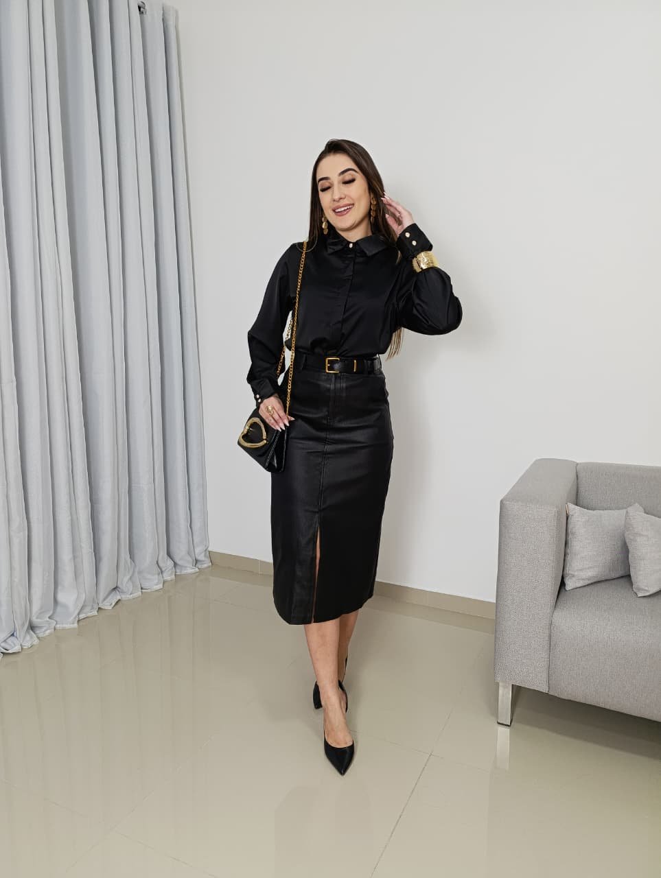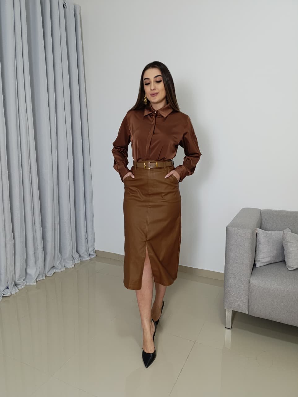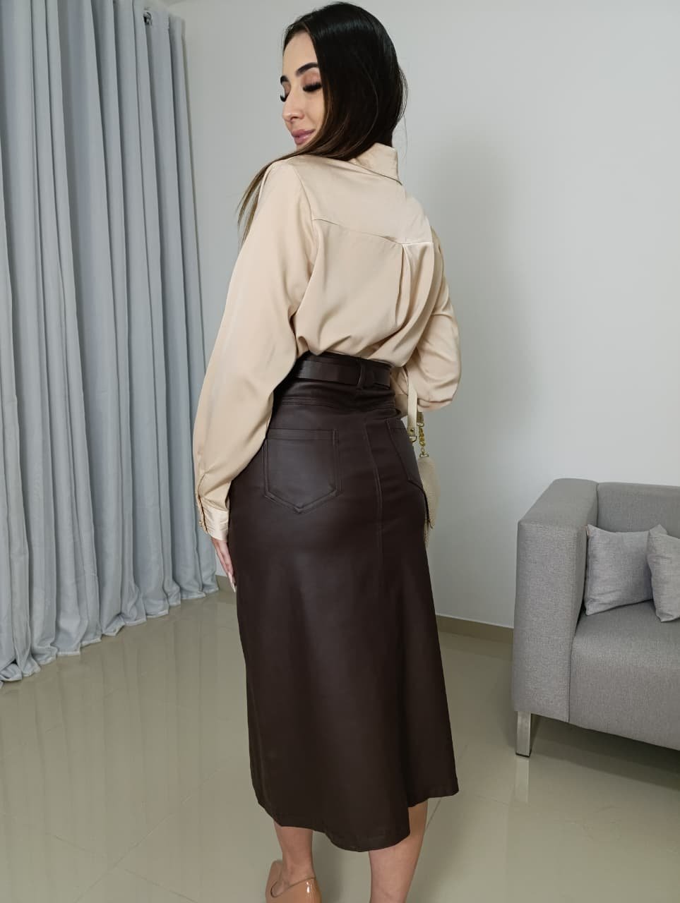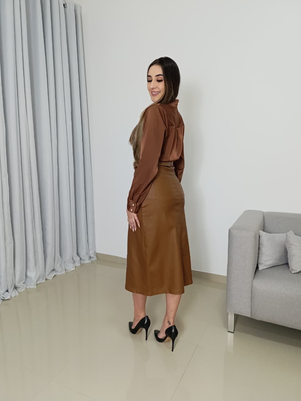 A Saia Midi Resinada da Meilin Moda é a peça indispensável para quem busca o equilíbrio perfeito entre o clássico e o ousado. Confeccionada em material resinado importado de alta tecnologia, ela entrega a estética luxuosa do couro sem o risco de craquelar. Graças à presença do elastano, a peça se molda ao corpo com suavidade, garantindo liberdade de movimento durante todo o dia.