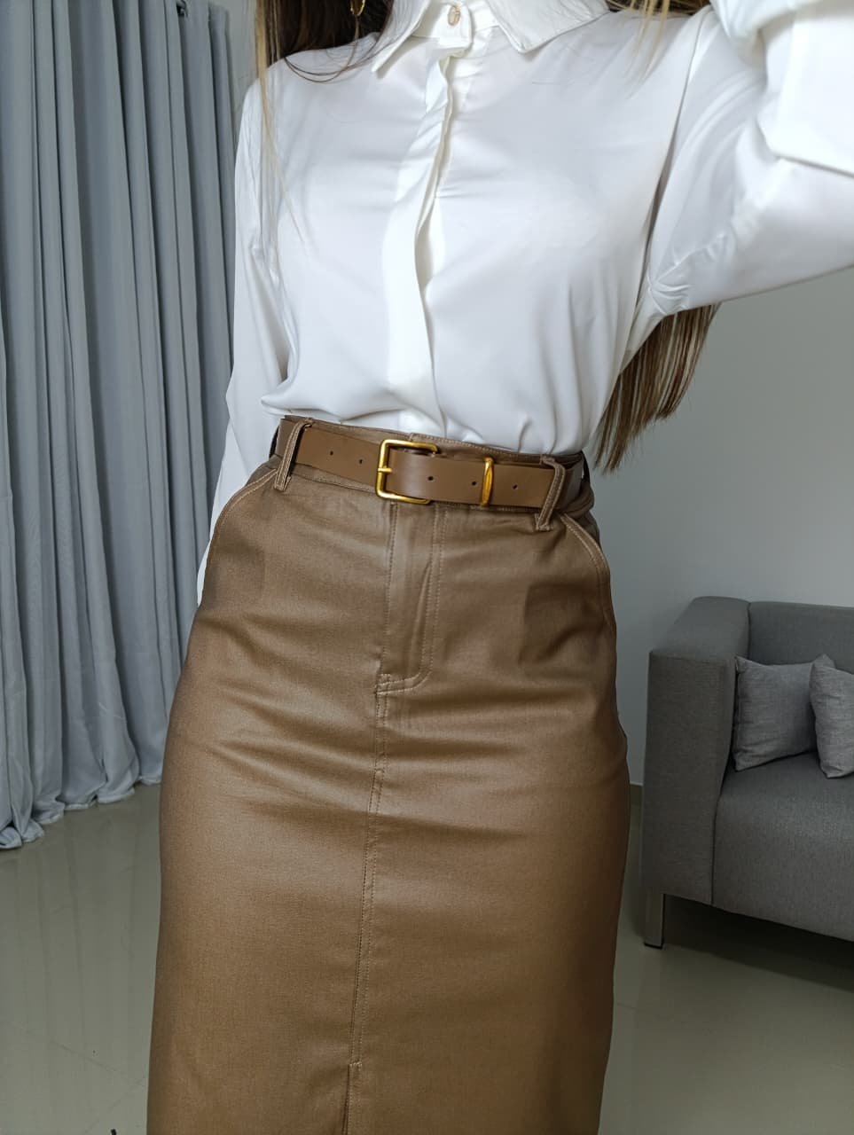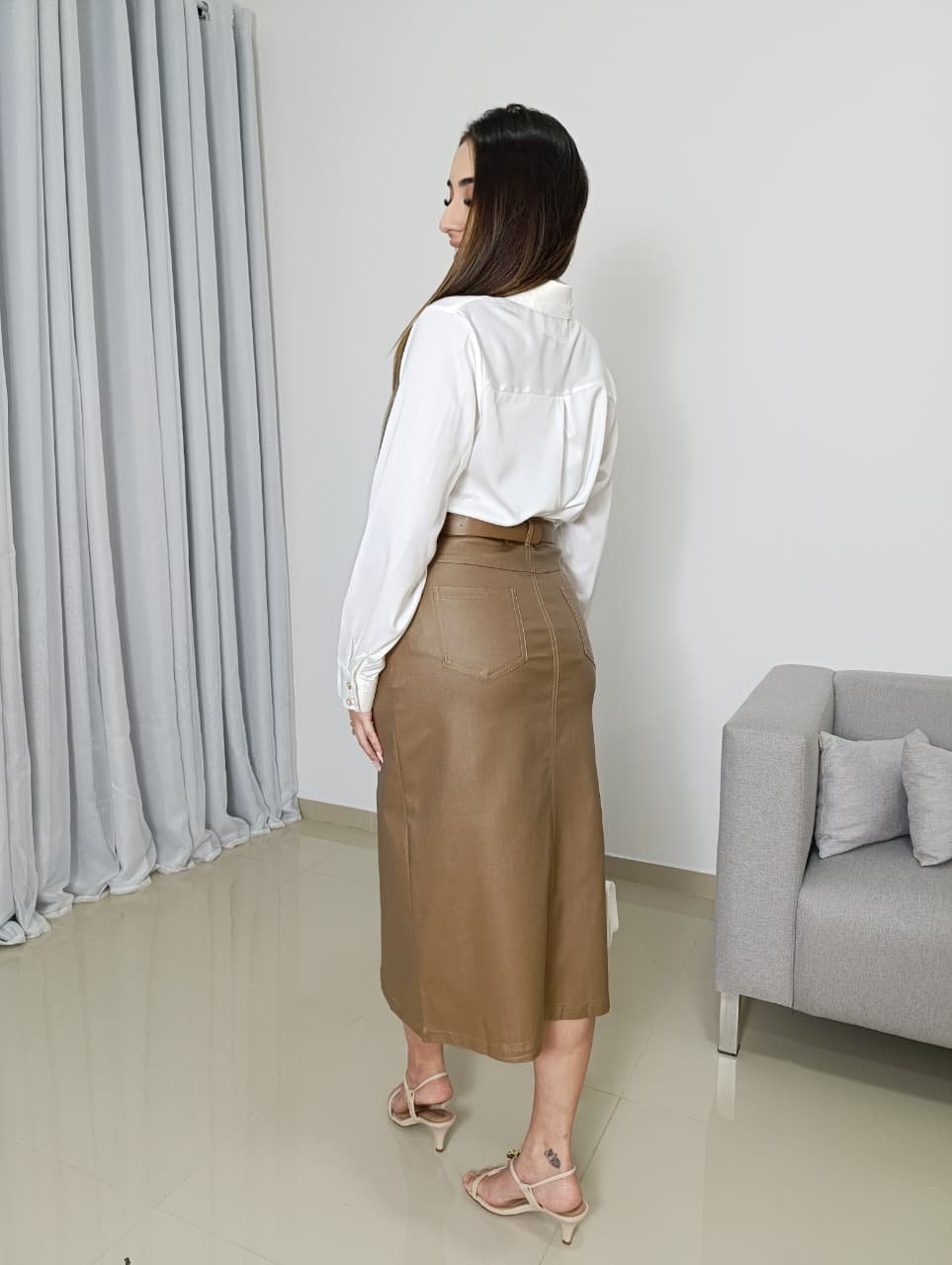Qualidade superior que não craquela. A Saia Resinada Midi é a peça-chave para mulheres que desejam transmitir autoridade e estilo com o máximo de conforto.