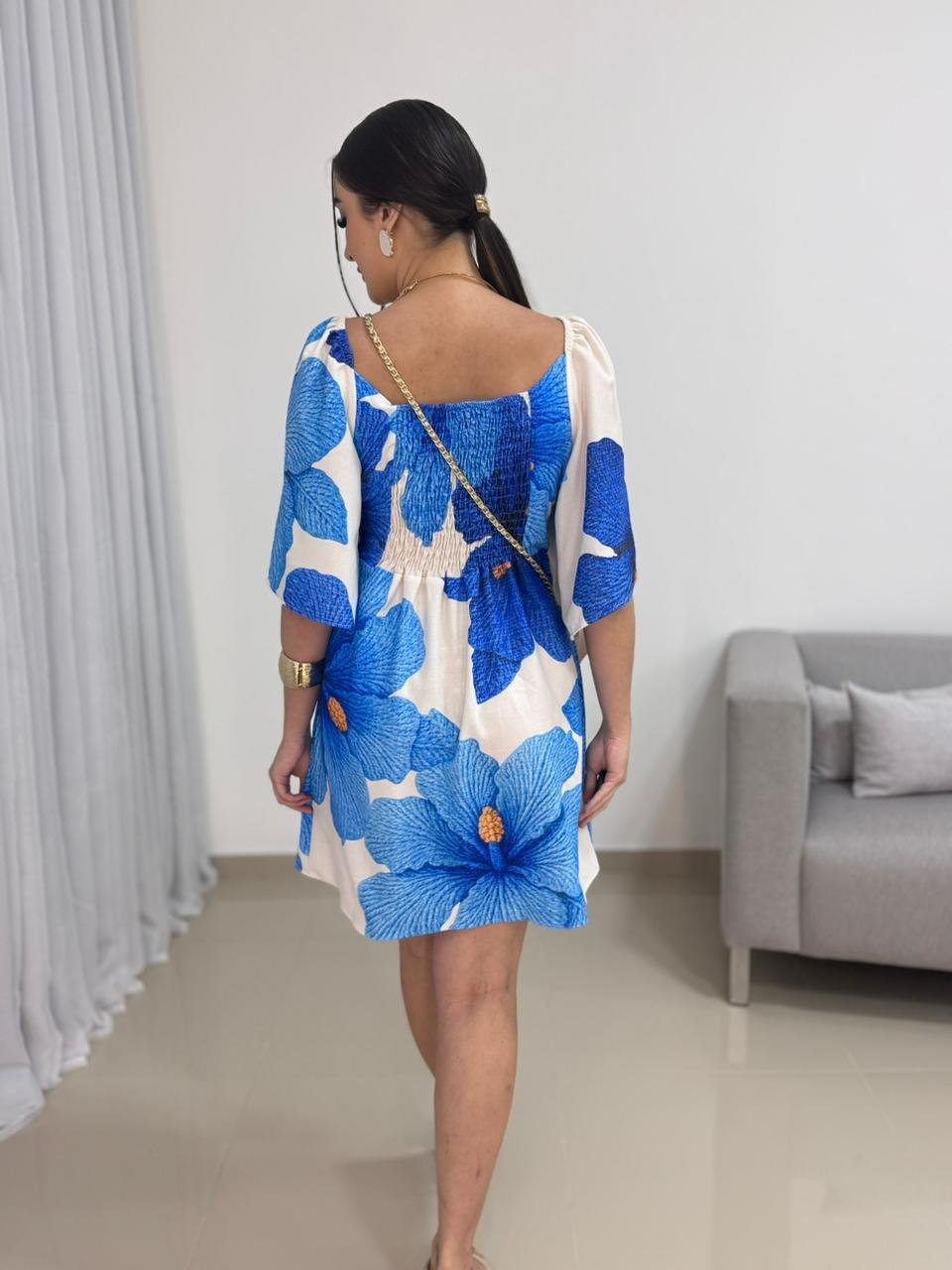 Destaque: Vestido Curto Tropical Azul com mangas amplas e lastex nas costas, garantindo conforto, ajuste perfeito e um visual leve e elegante.