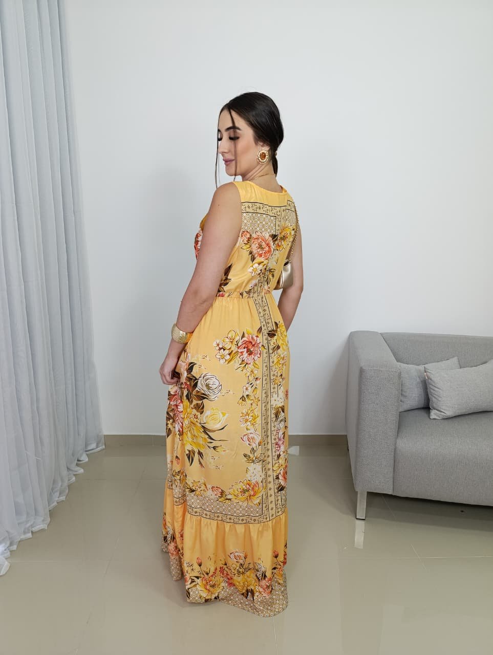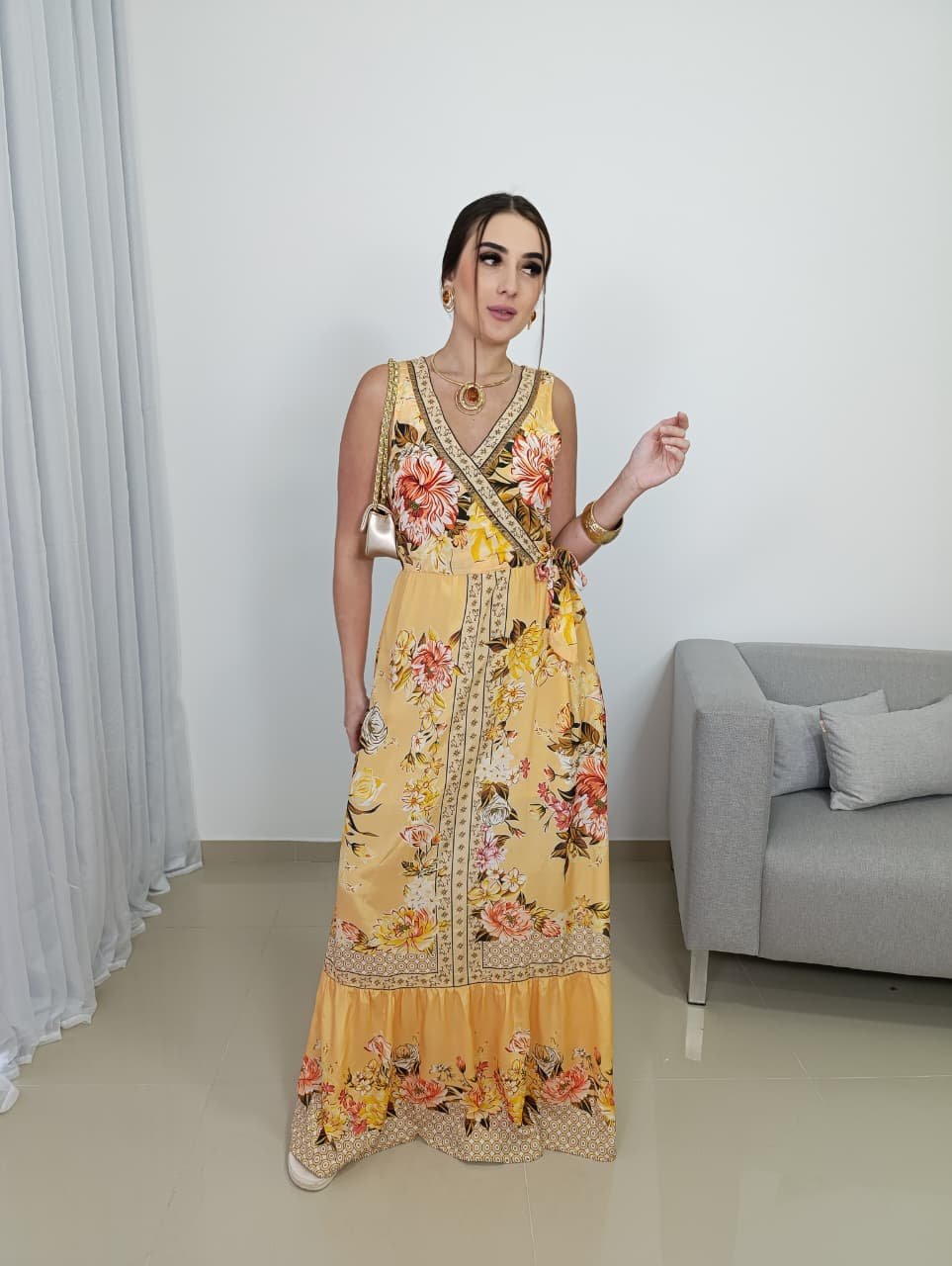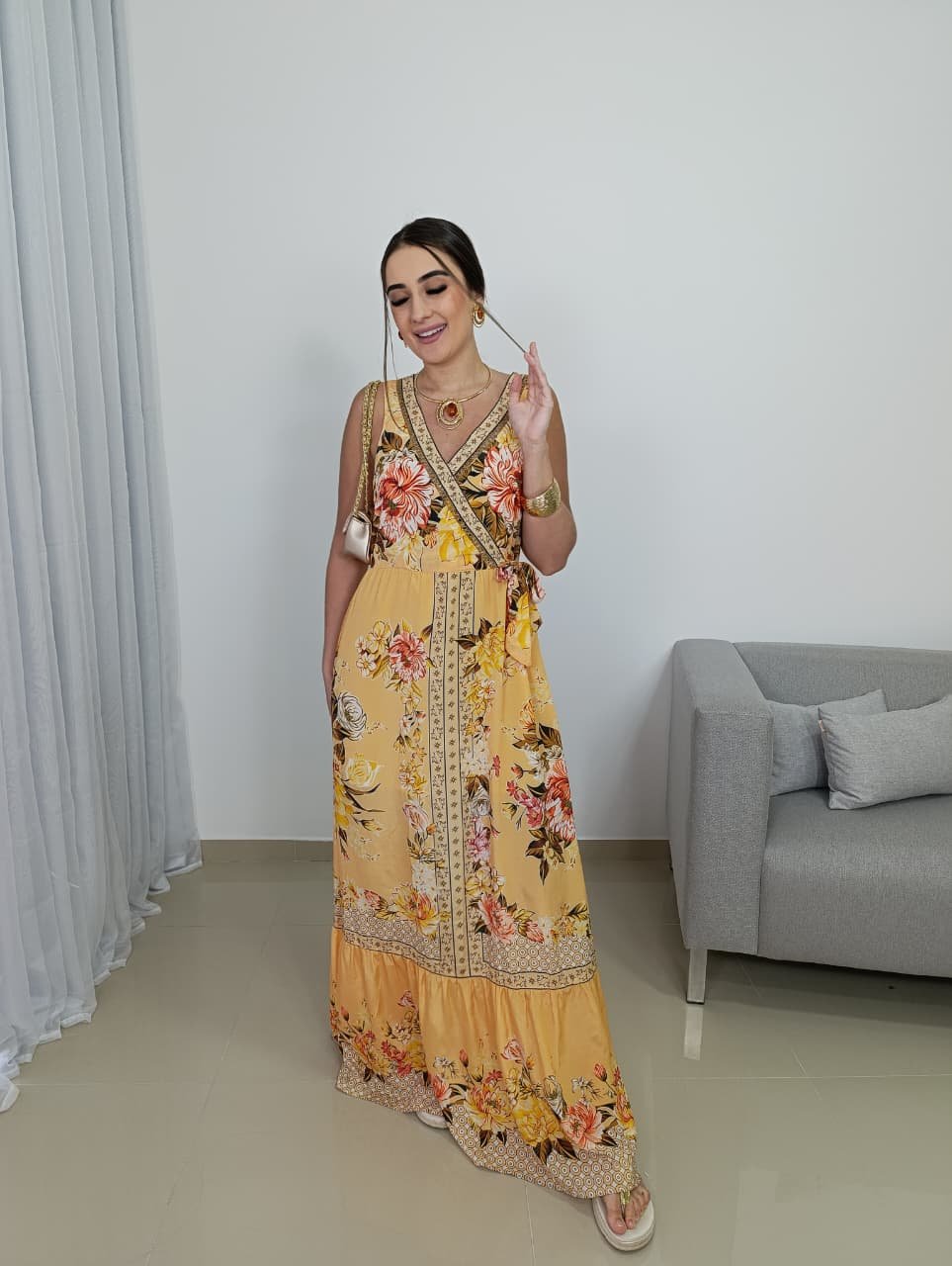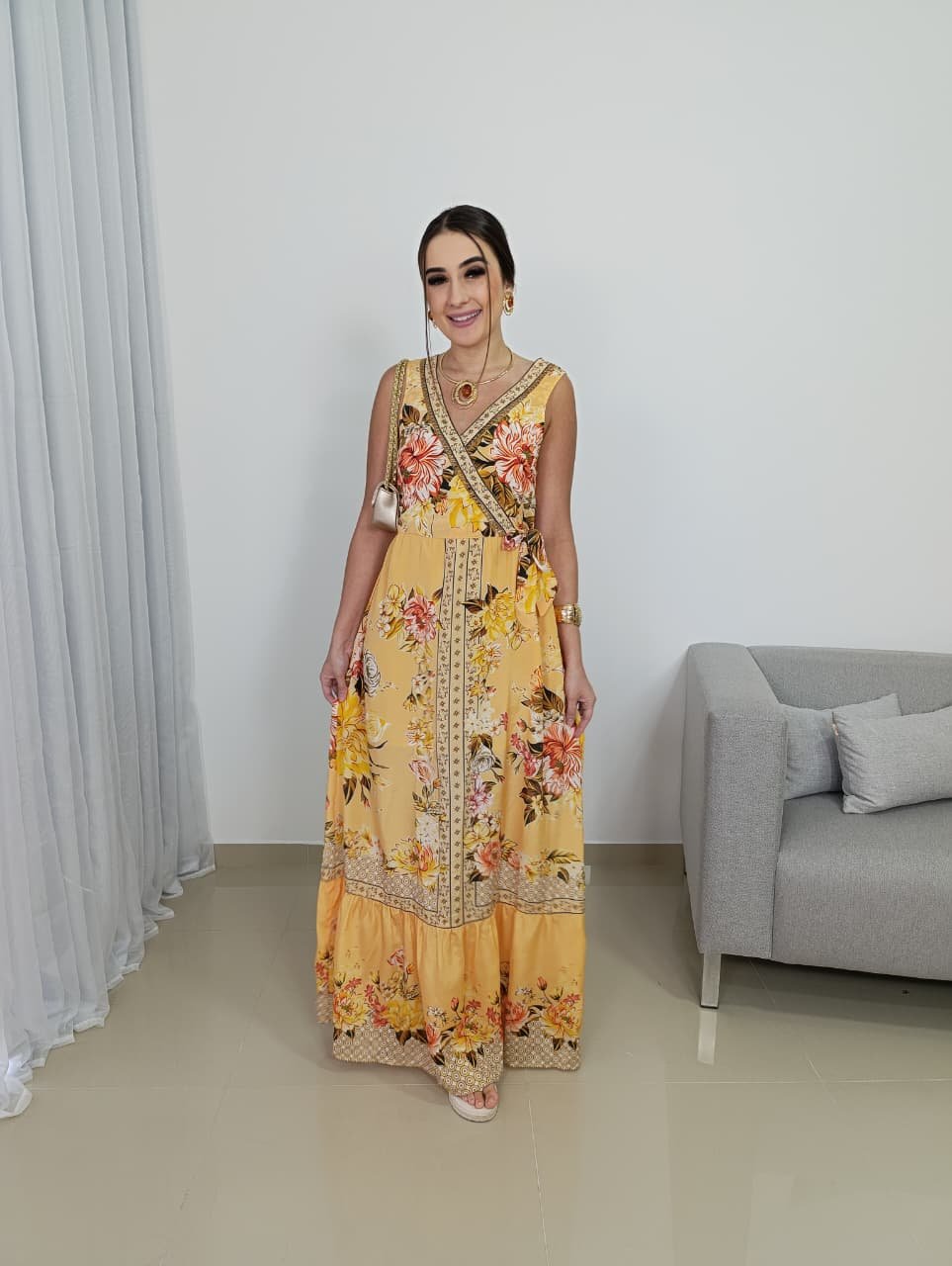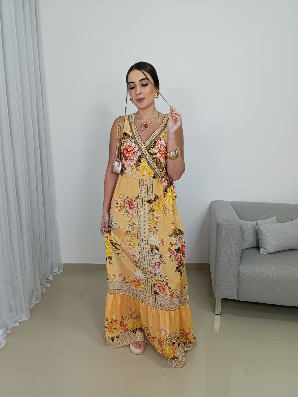 A estampa floral com inspiração indiana combina tons quentes e delicados, criando um visual marcante, porém equilibrado. O recorte na cintura ajuda a definir a silhueta, enquanto a saia longa garante movimento e elegância a cada passo. Por não possuir bojo, o vestido se adapta melhor a diferentes tipos de corpo, mantendo um visual leve e confortável, ideal para longos períodos de uso.