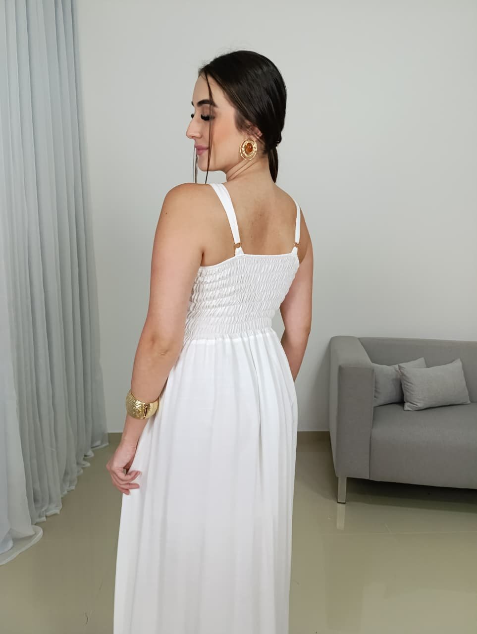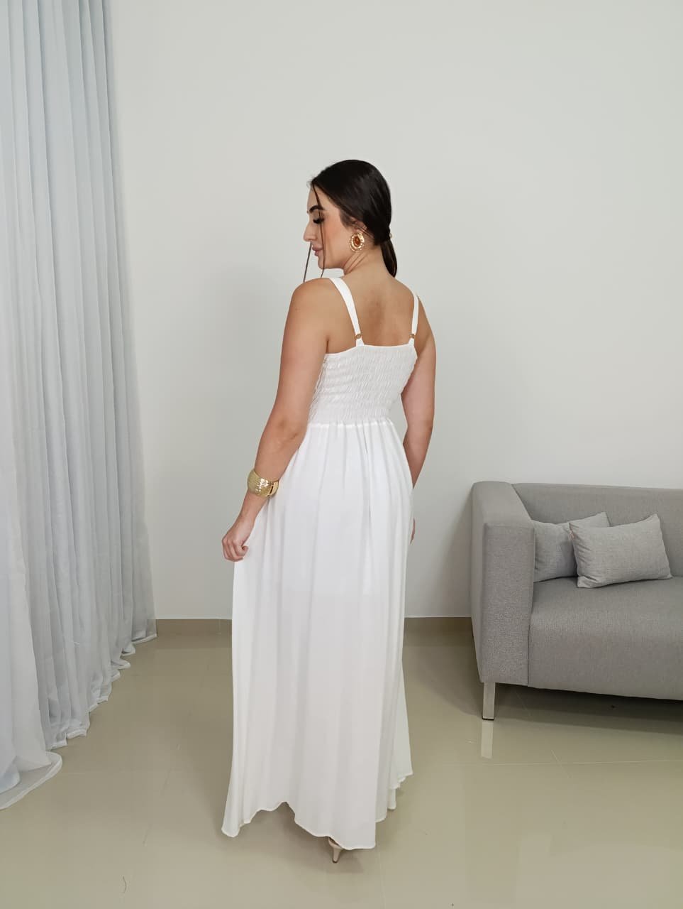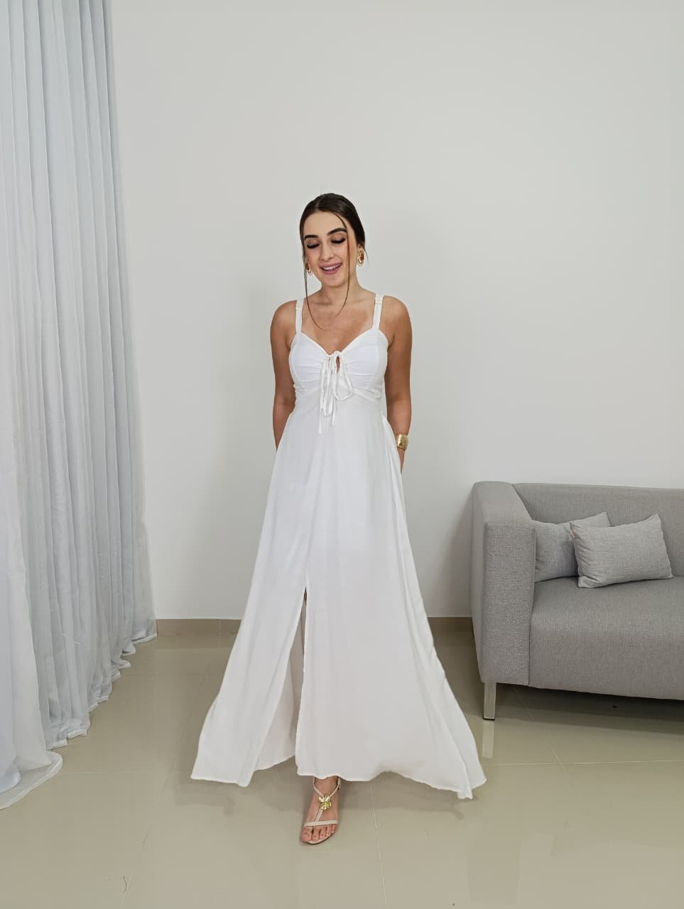 A fenda frontal adiciona charme e movimento à peça, trazendo um toque de sensualidade equilibrada e elegância. A modelagem longa alonga a silhueta e valoriza as curvas sem marcar, tornando o vestido ideal tanto para o dia quanto para a noite, dependendo da composição de acessórios e calçados.