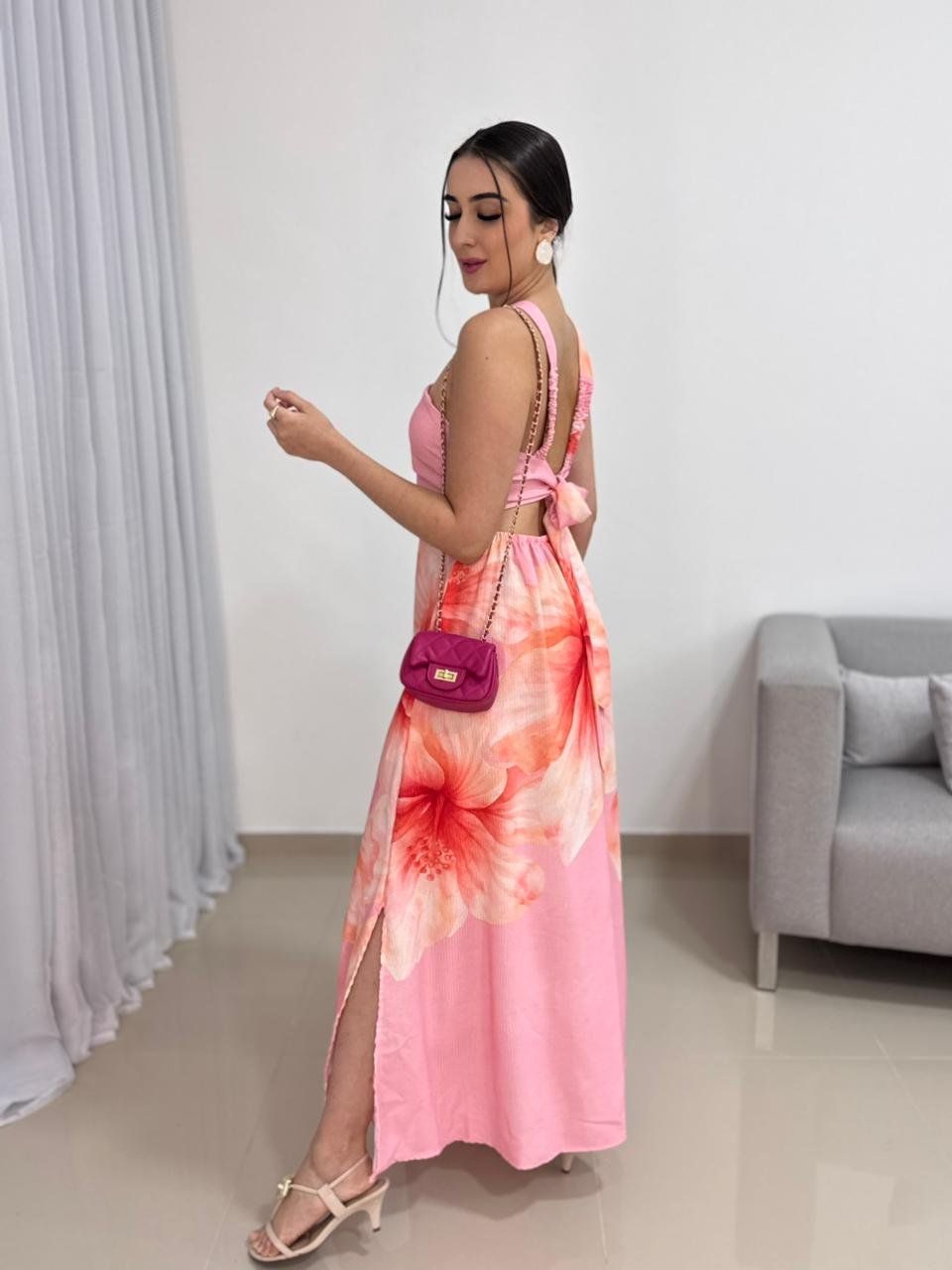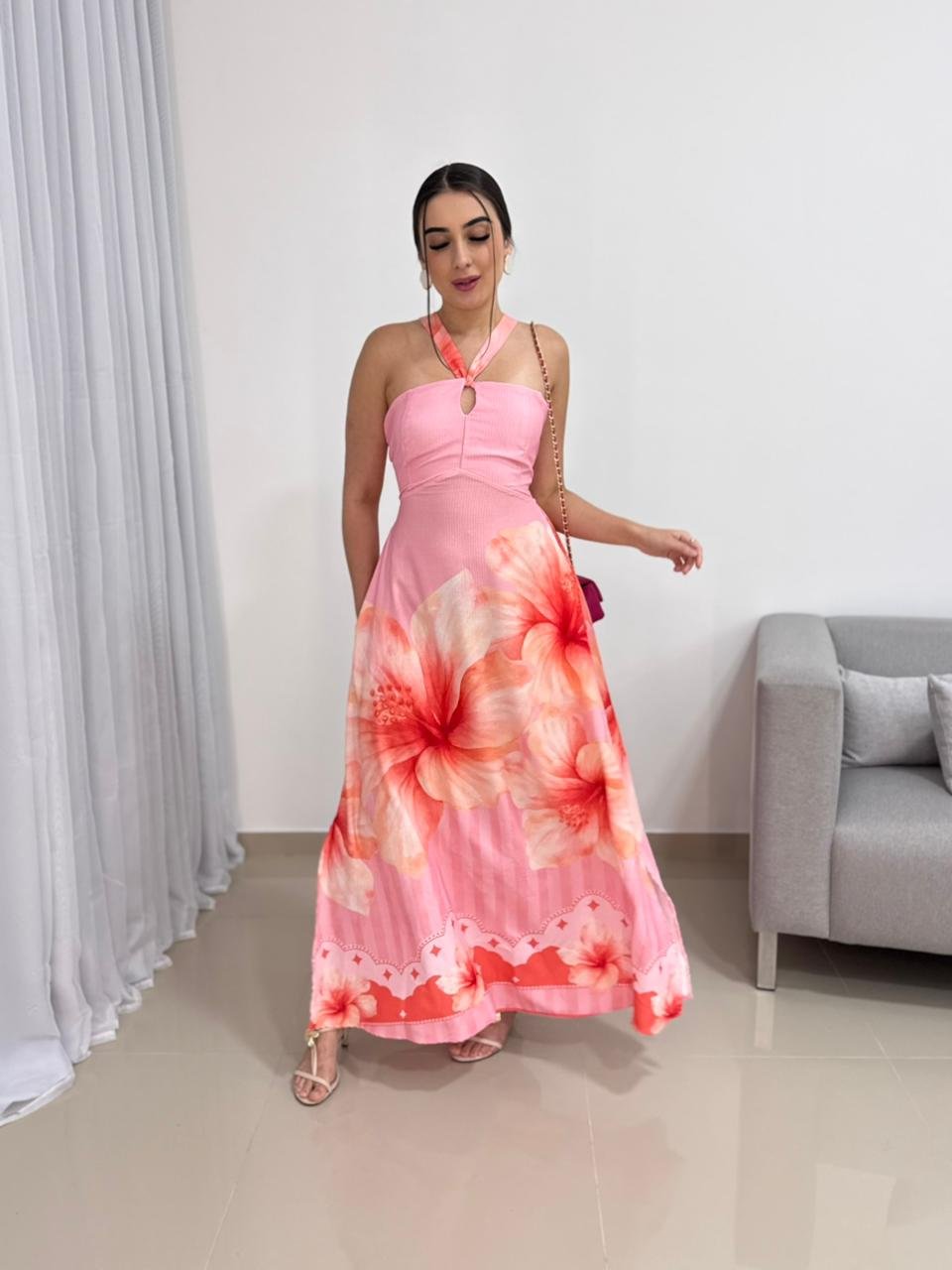 O comprimento longo aliado ao caimento fluido da saia cria movimento e sofisticação ao caminhar, enquanto o decote delicado valoriza o colo sem exageros. É uma peça perfeita para eventos diurnos, passeios, viagens, festas ao ar livre ou até produções mais elaboradas quando combinada com acessórios e salto.