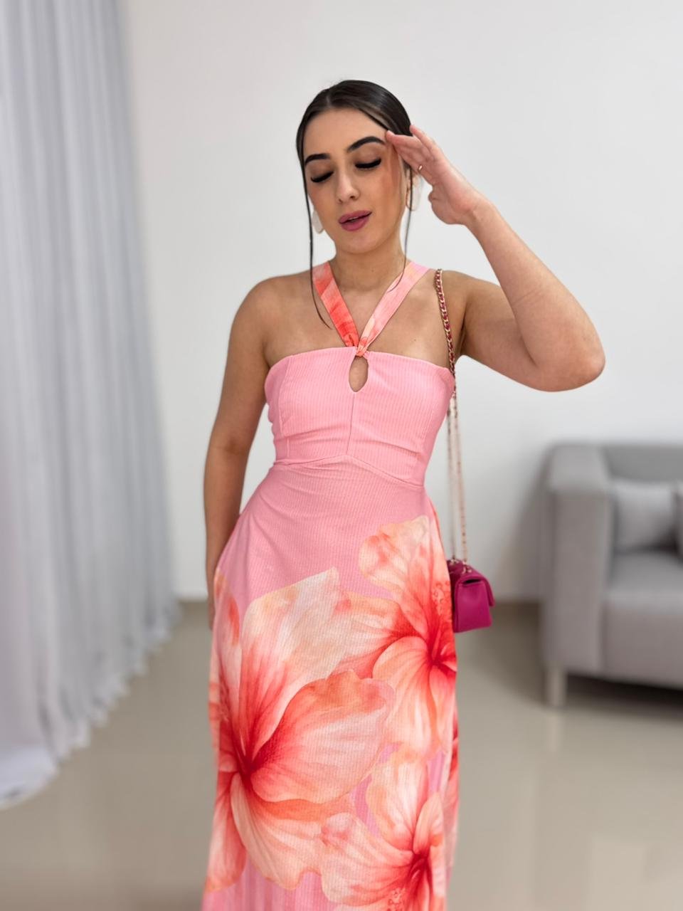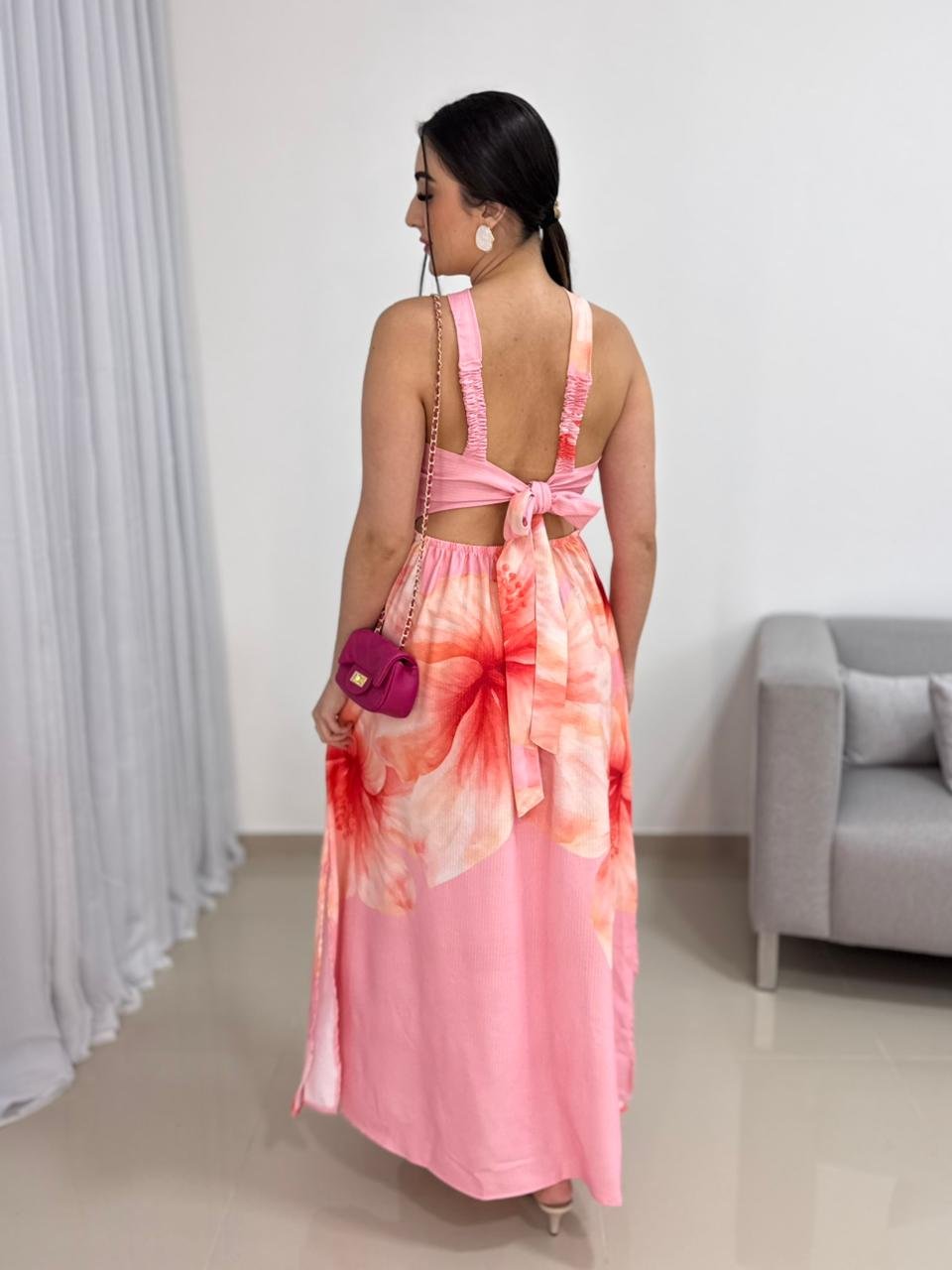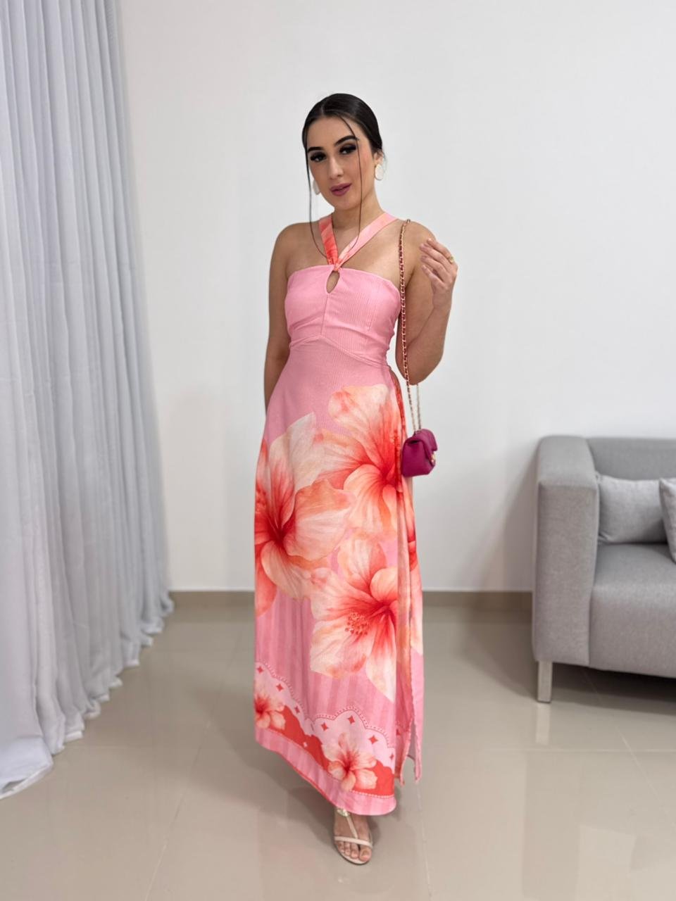Este vestido longo em viscolinho com estampa tropical é a definição perfeita de frescor, feminilidade e charme para os dias mais quentes. O tecido leve e respirável proporciona conforto absoluto ao vestir, enquanto a estampa tropical em tons suaves traz um visual alegre, elegante e extremamente atual. Ideal para quem busca uma peça marcante, mas ao mesmo tempo confortável e fácil de usar.
