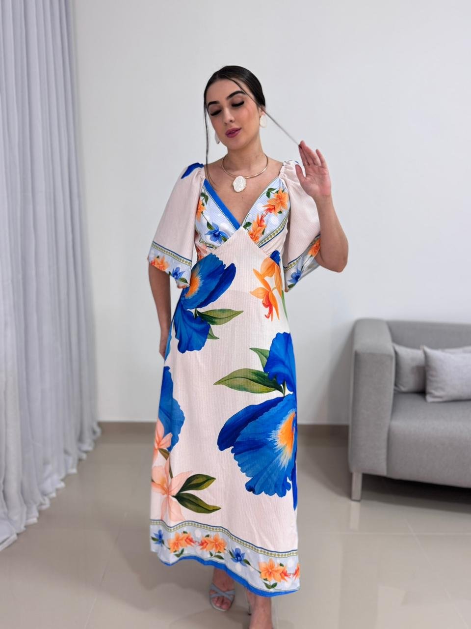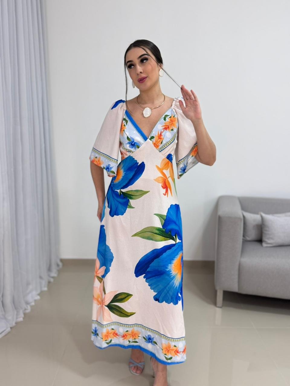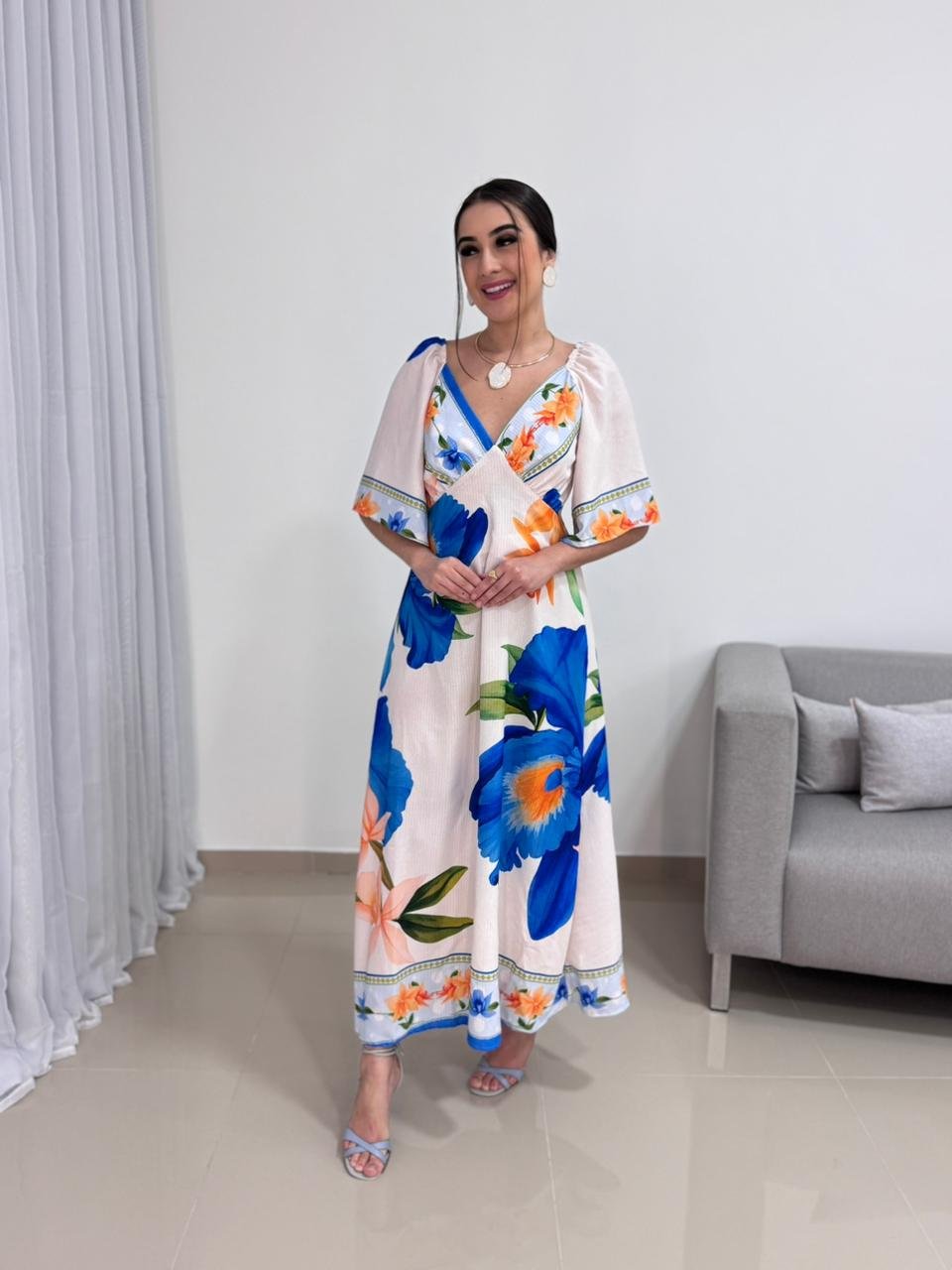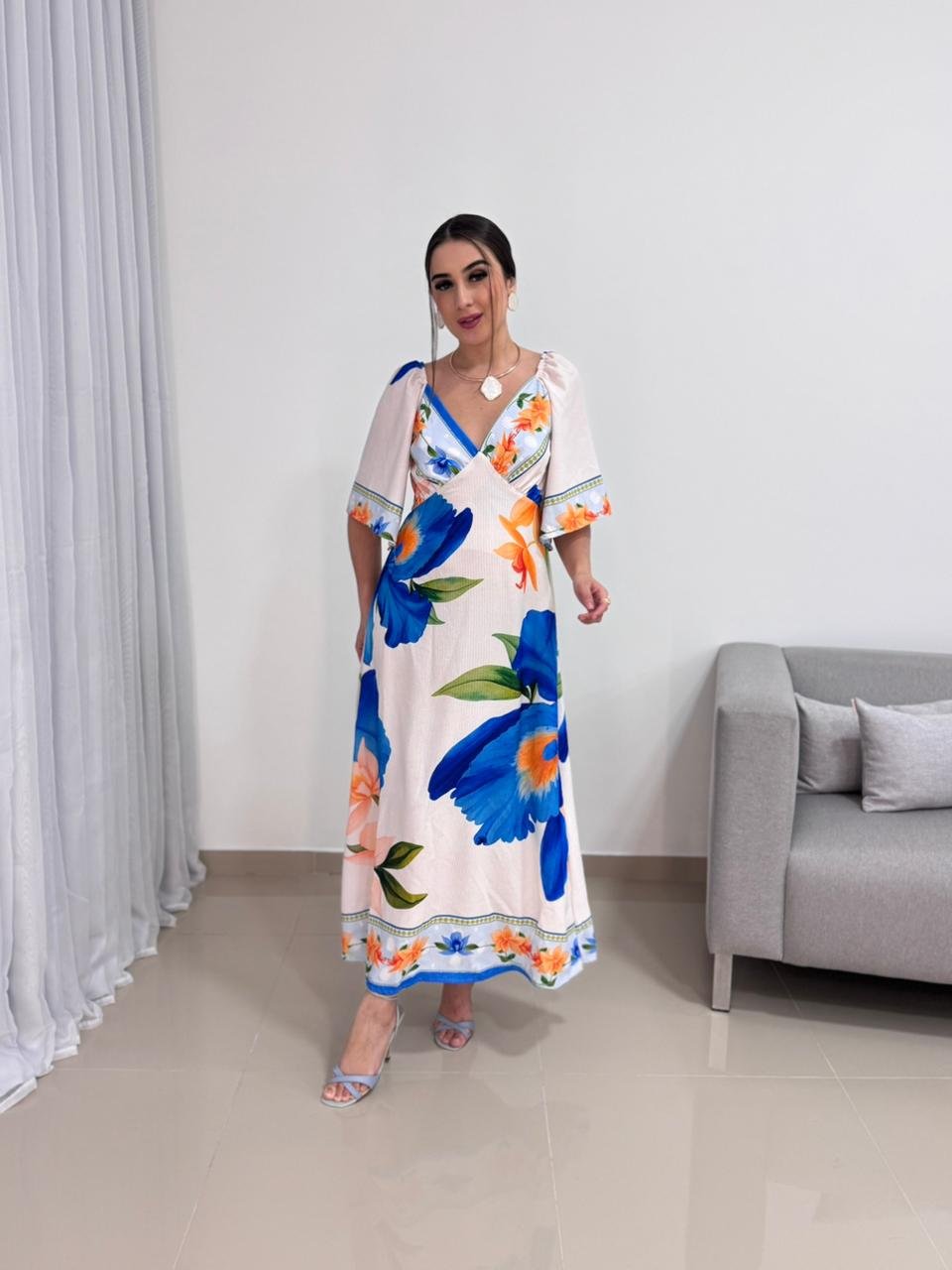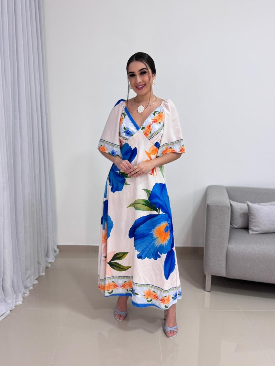 O decote em V valoriza o colo de forma elegante e alonga a silhueta, criando um visual equilibrado e harmonioso. As mangas curtas e soltas trazem leveza e movimento à peça, além de acrescentarem um toque delicado ao design. A estampa floral em tons de azul e laranja cria um contraste vibrante e sofisticado, tornando o vestido atemporal e fácil de combinar com acessórios neutros, dourados ou coloridos.