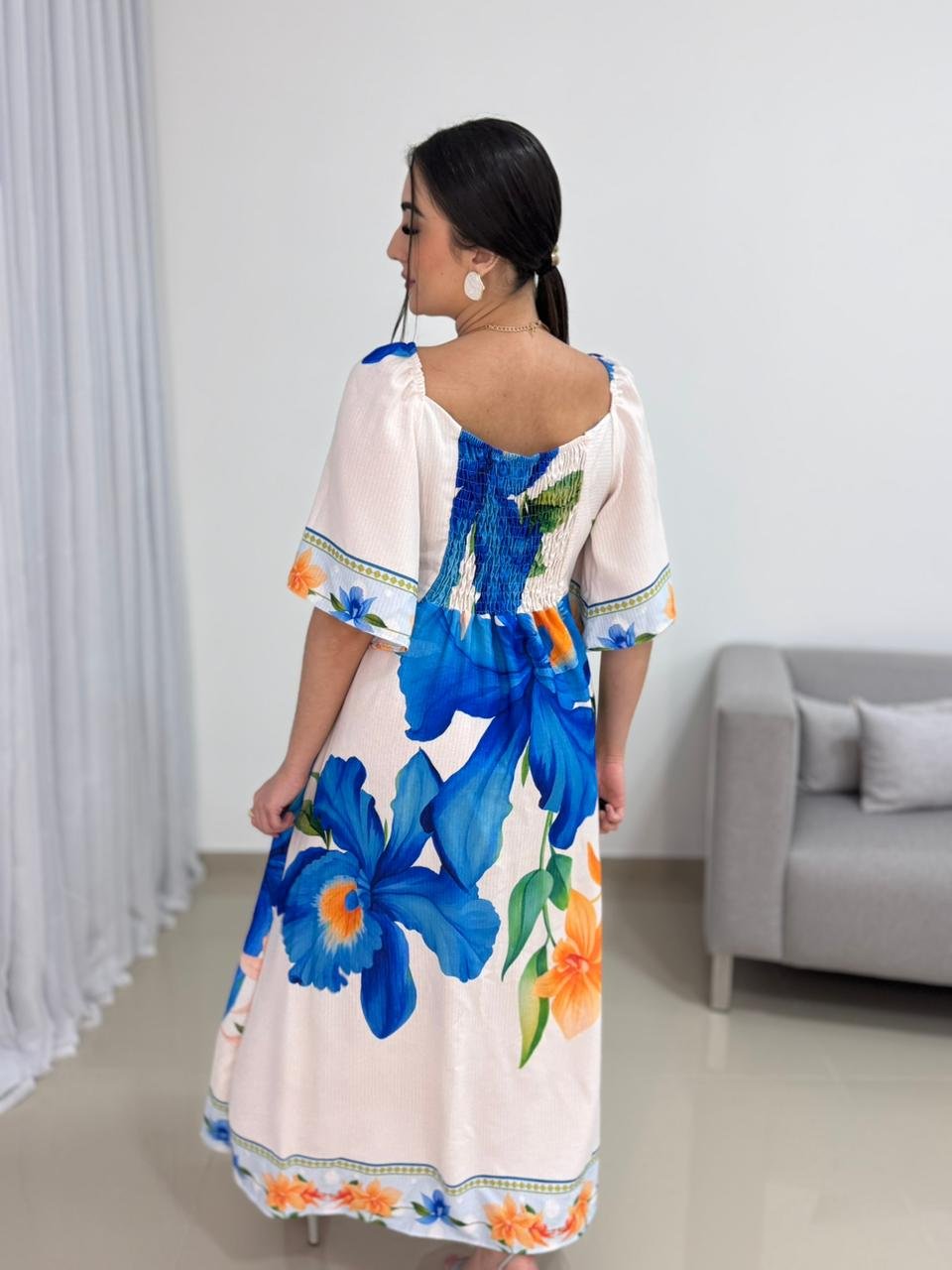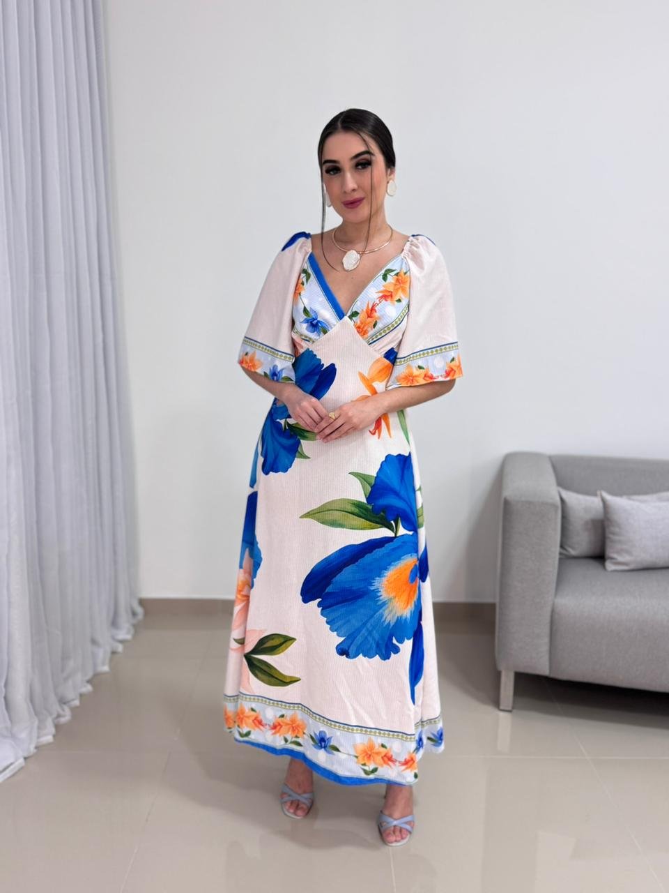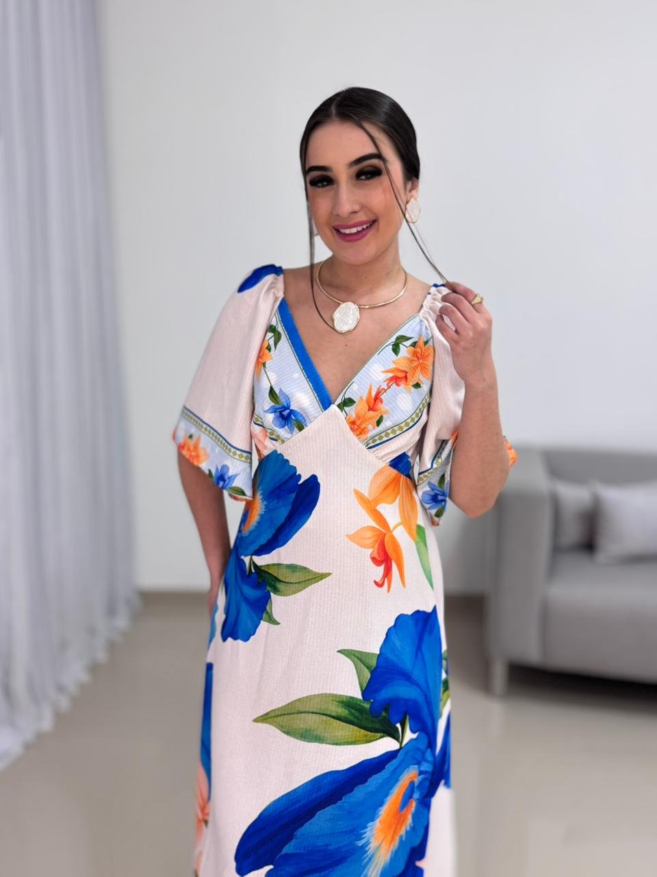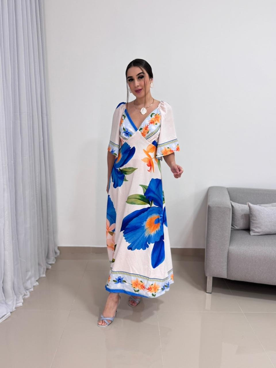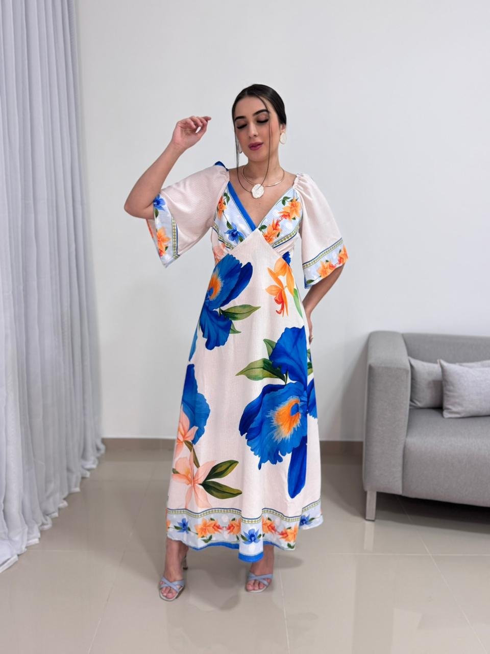 O decote em V valoriza o colo de forma elegante e alonga a silhueta, criando um visual equilibrado e harmonioso. As mangas curtas e soltas trazem leveza e movimento à peça, além de acrescentarem um toque delicado ao design. A estampa floral em tons de azul e laranja cria um contraste vibrante e sofisticado, tornando o vestido atemporal e fácil de combinar com acessórios neutros, dourados ou coloridos.