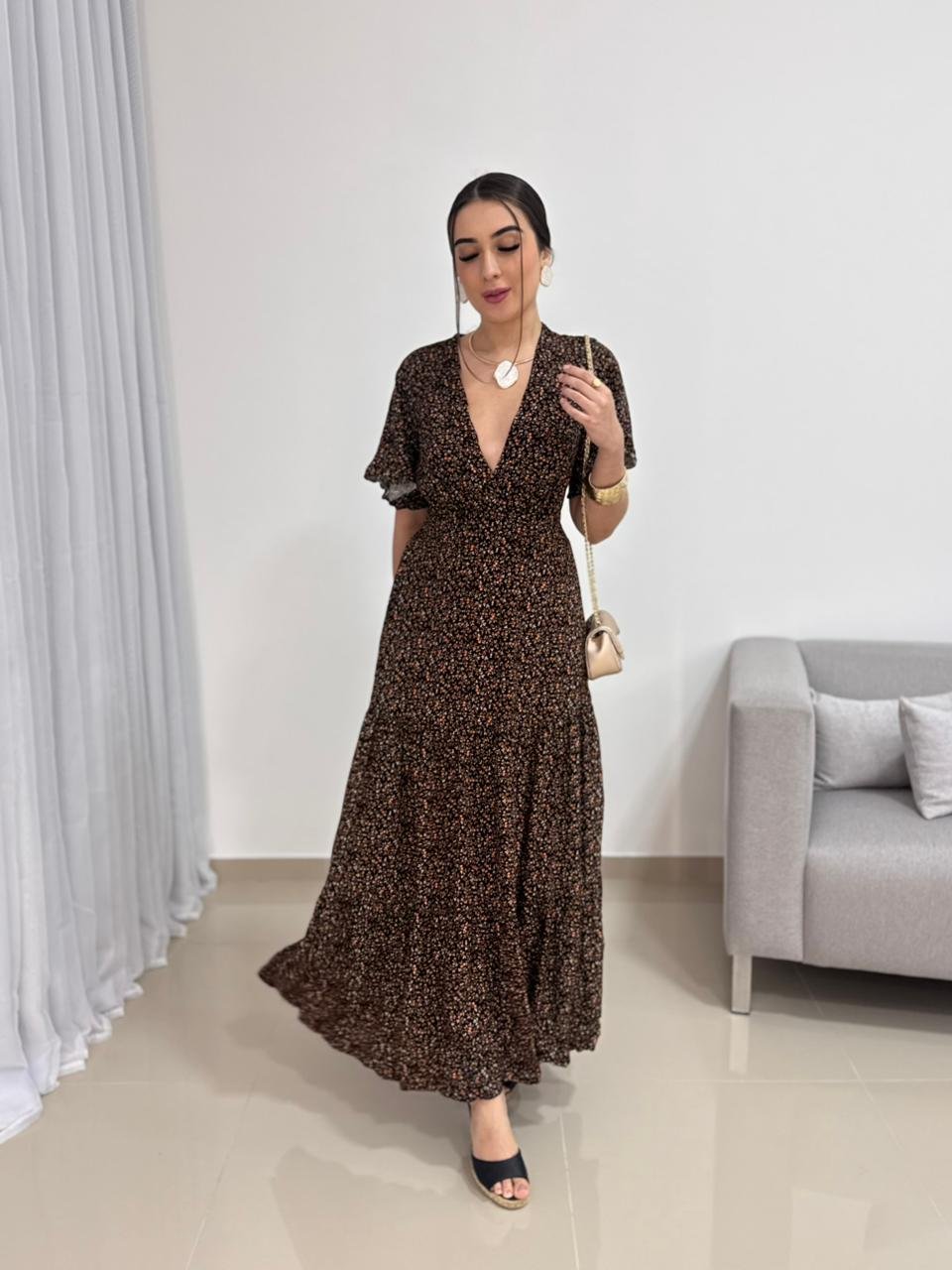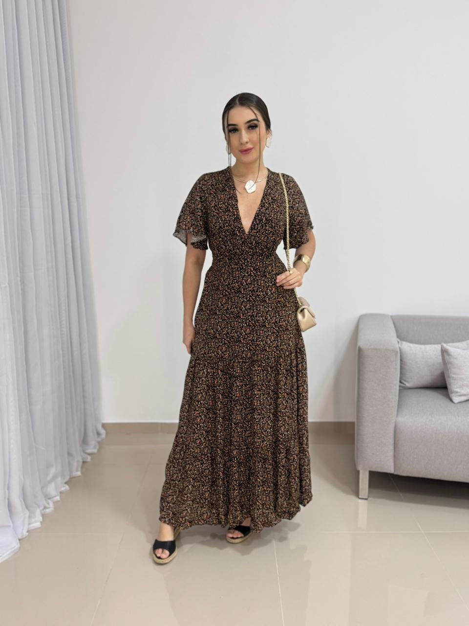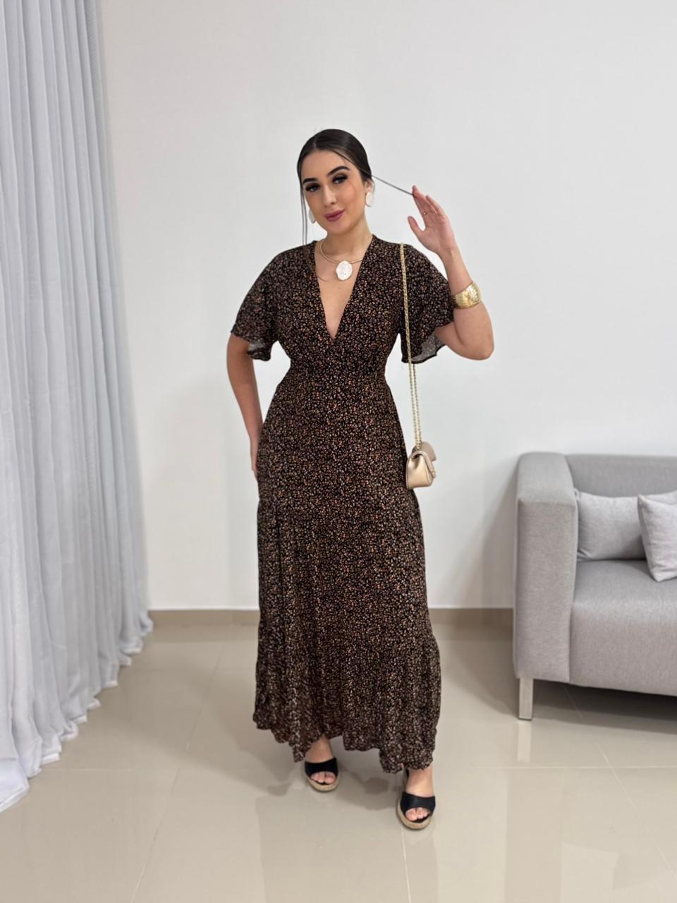 Na parte de trás, o vestido conta com lastex, garantindo ajuste perfeito ao corpo, elasticidade e conforto ao vestir. Esse detalhe permite que a peça se adapte bem aos diferentes biotipos dentro da numeração proposta. A saia longa possui caimento fluido e movimento suave, acompanhando o caminhar com leveza e sofisticação. Versátil, combina facilmente com sandálias, salto bloco, anabelas ou rasteiras, além de acessórios dourados ou neutros.