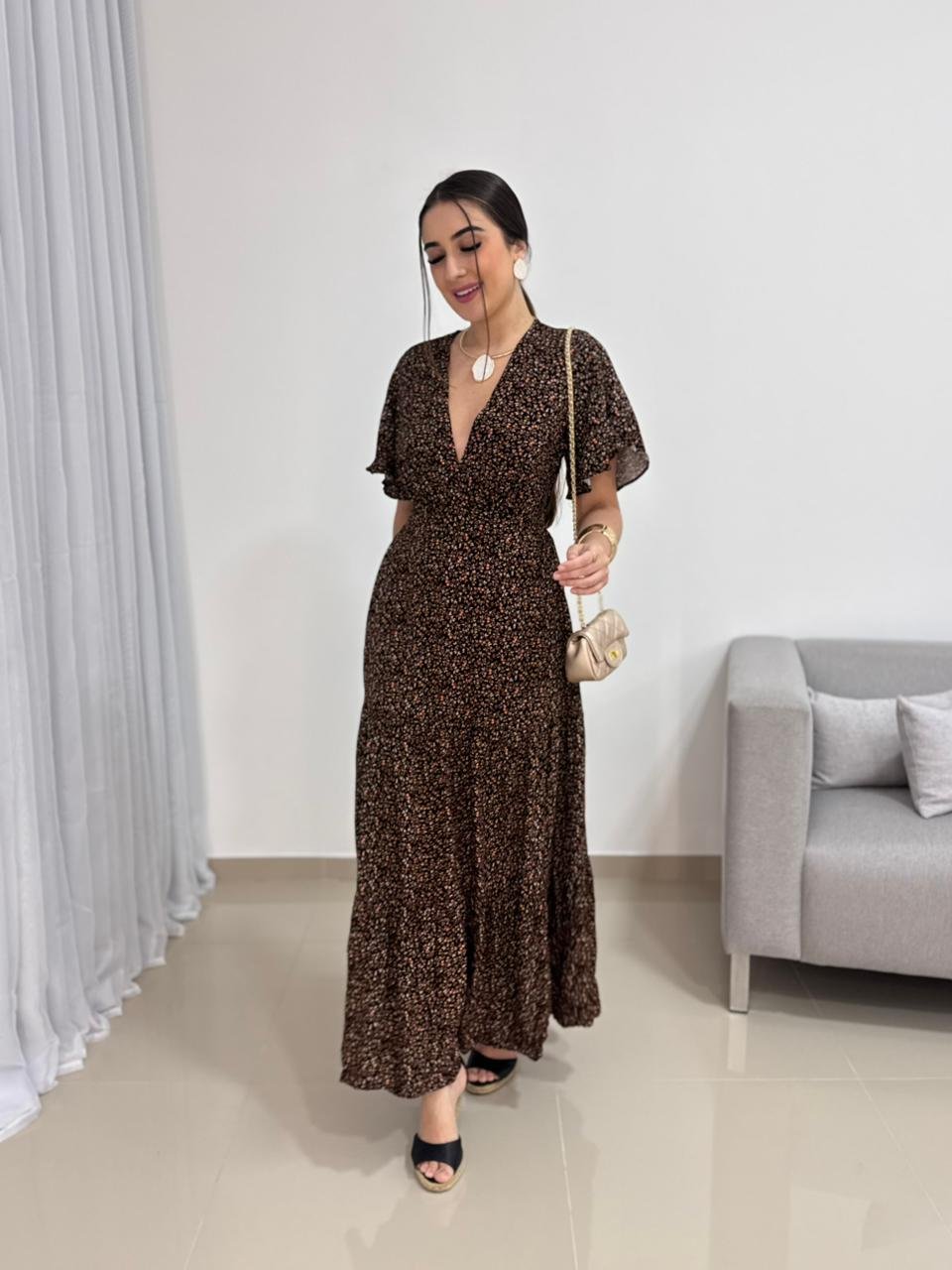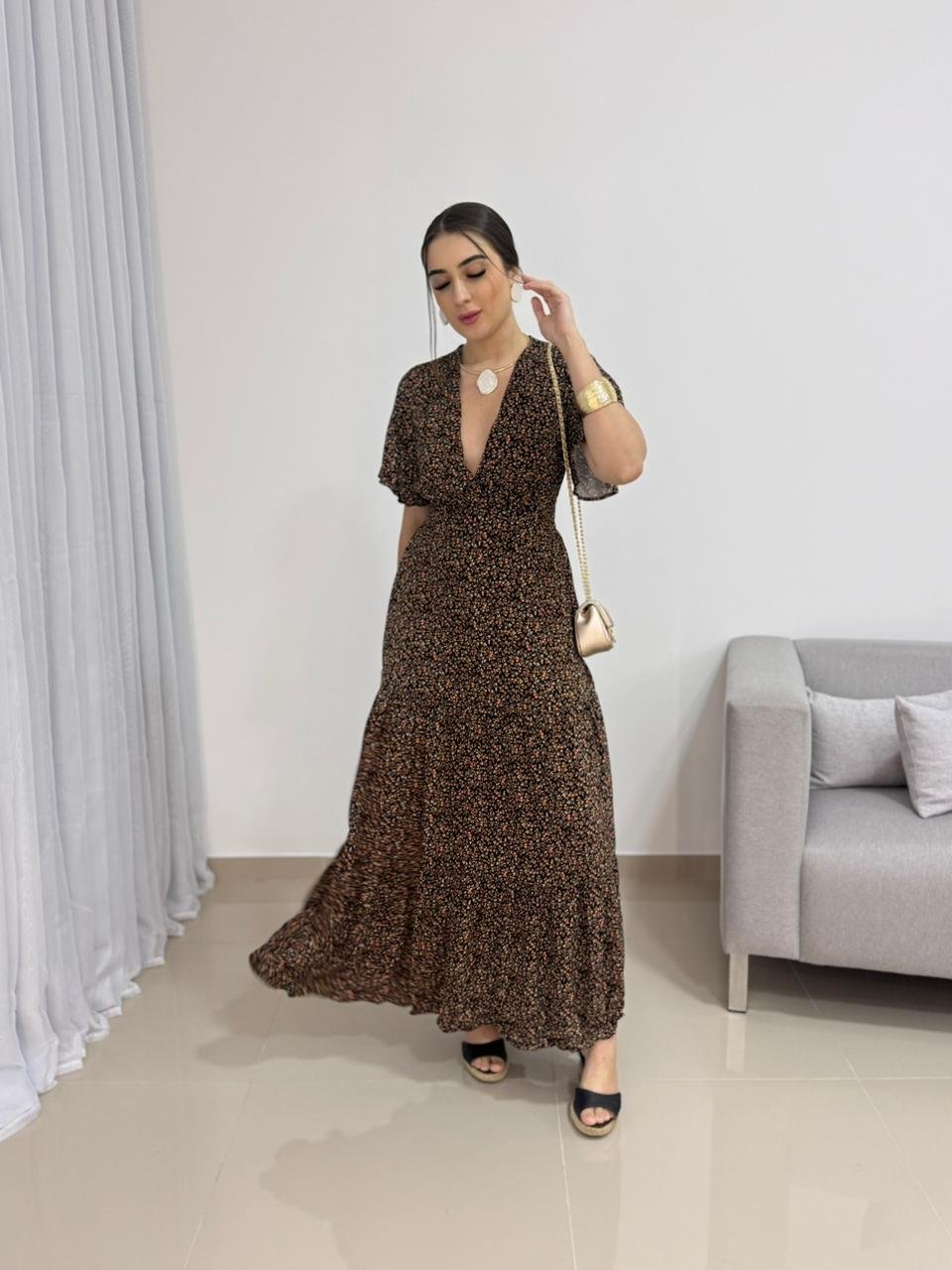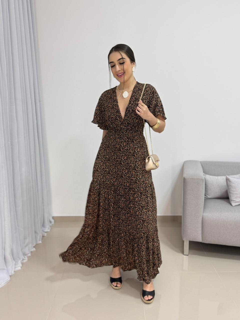 Na parte de trás, o vestido conta com lastex, garantindo ajuste perfeito ao corpo, elasticidade e conforto ao vestir. Esse detalhe permite que a peça se adapte bem aos diferentes biotipos dentro da numeração proposta. A saia longa possui caimento fluido e movimento suave, acompanhando o caminhar com leveza e sofisticação. Versátil, combina facilmente com sandálias, salto bloco, anabelas ou rasteiras, além de acessórios dourados ou neutros.
