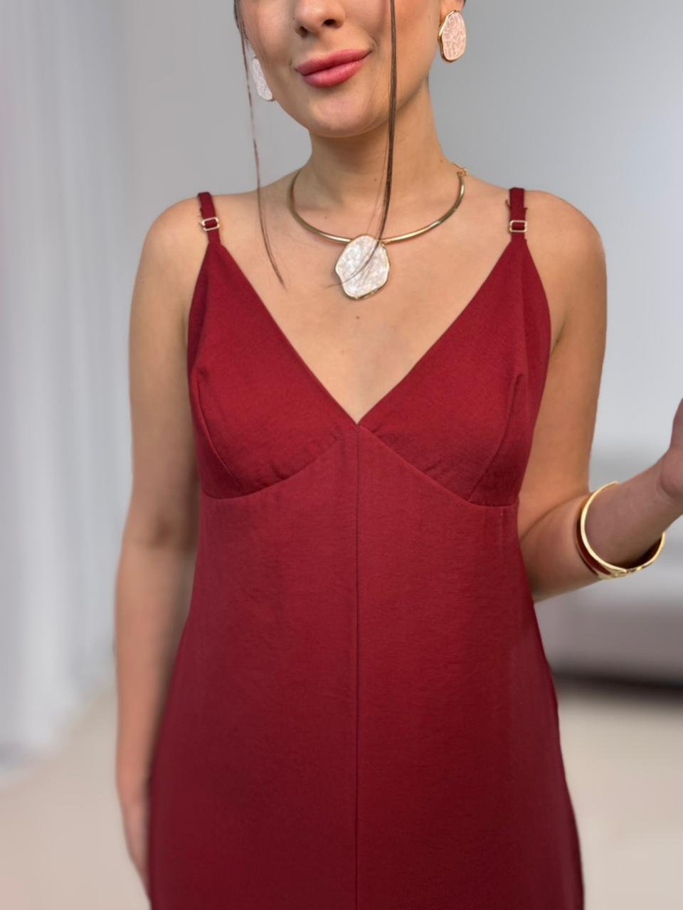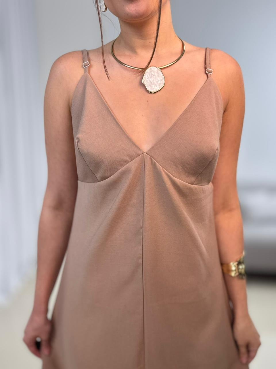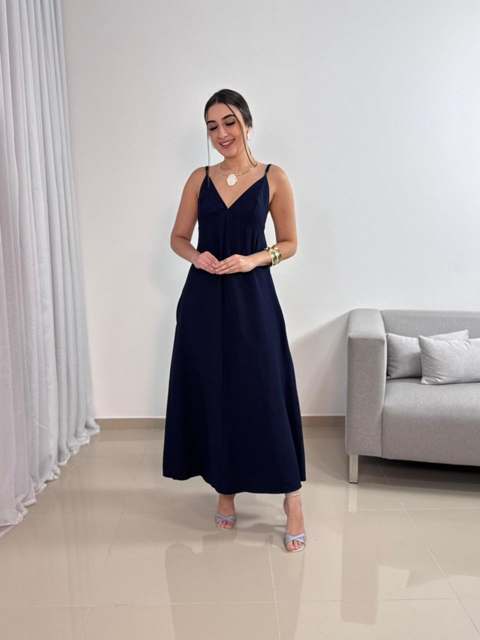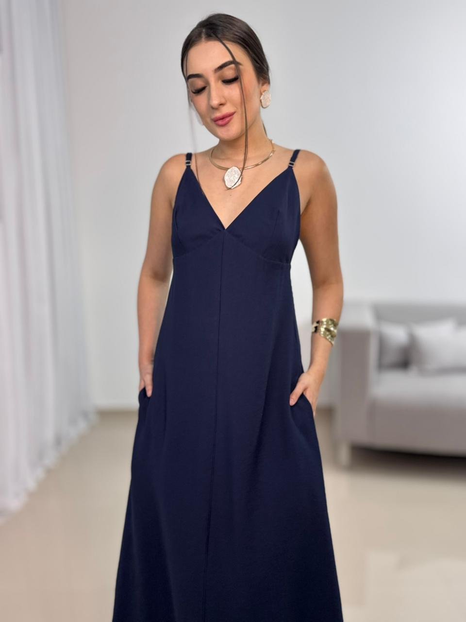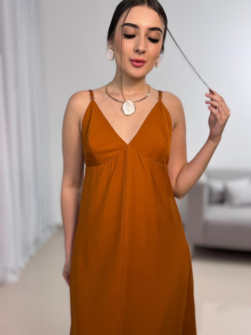 O vestido apresenta decote em V, que valoriza o colo de forma natural e alonga a silhueta. O modelo não possui bojo, garantindo um caimento mais leve e natural, ideal para quem prefere conforto e liberdade ao vestir. As alças finas ajustáveis trazem delicadeza ao visual e permitem melhor ajuste conforme o corpo.