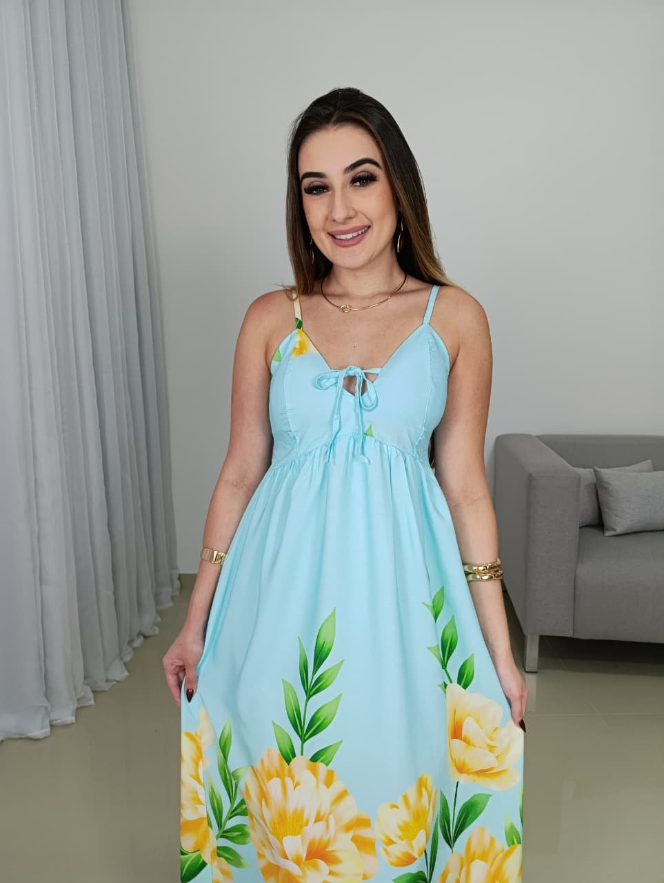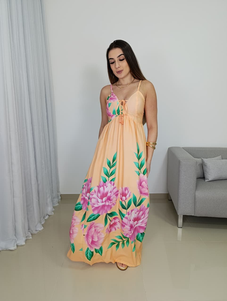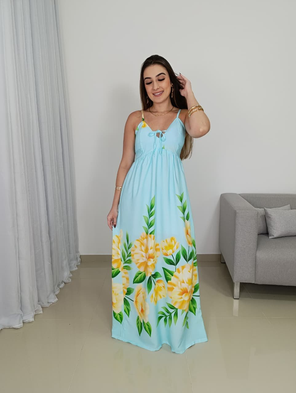 A modelagem conta com decote em V delicado, que valoriza o colo de forma natural, além de alças finas reguláveis que garantem melhor ajuste ao corpo. A parte das costas possui lastex, oferecendo elasticidade e conforto, adaptando-se facilmente a diferentes biotipos e vestindo bem do 36 ao 42. O recorte abaixo do busto cria um efeito alongador na silhueta, enquanto a saia longa traz movimento e elegância ao caminhar.