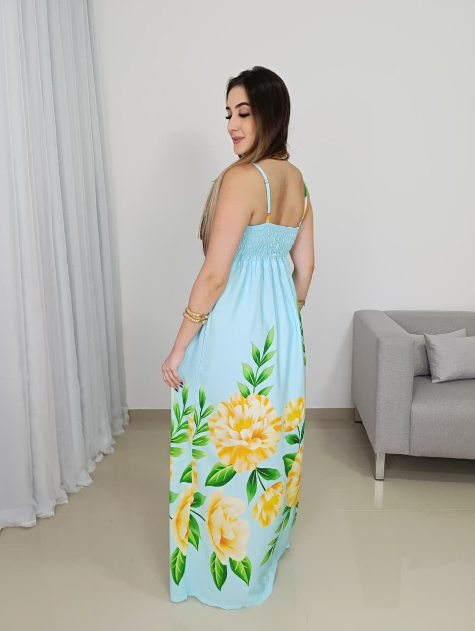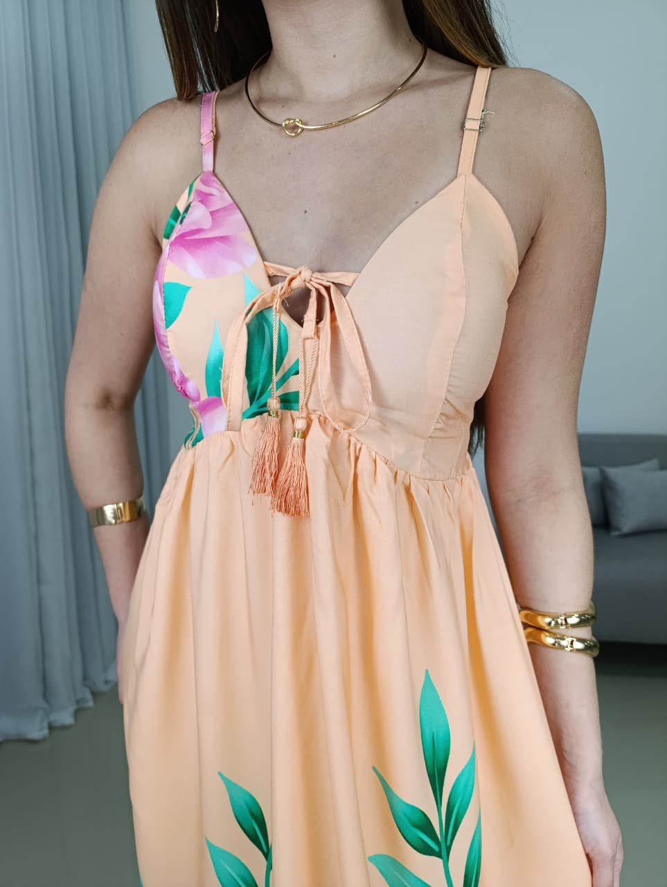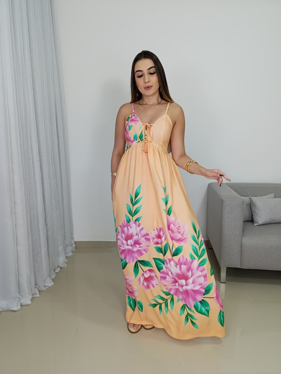 A modelagem conta com decote em V delicado, que valoriza o colo de forma natural, além de alças finas reguláveis que garantem melhor ajuste ao corpo. A parte das costas possui lastex, oferecendo elasticidade e conforto, adaptando-se facilmente a diferentes biotipos e vestindo bem do 36 ao 42. O recorte abaixo do busto cria um efeito alongador na silhueta, enquanto a saia longa traz movimento e elegância ao caminhar.