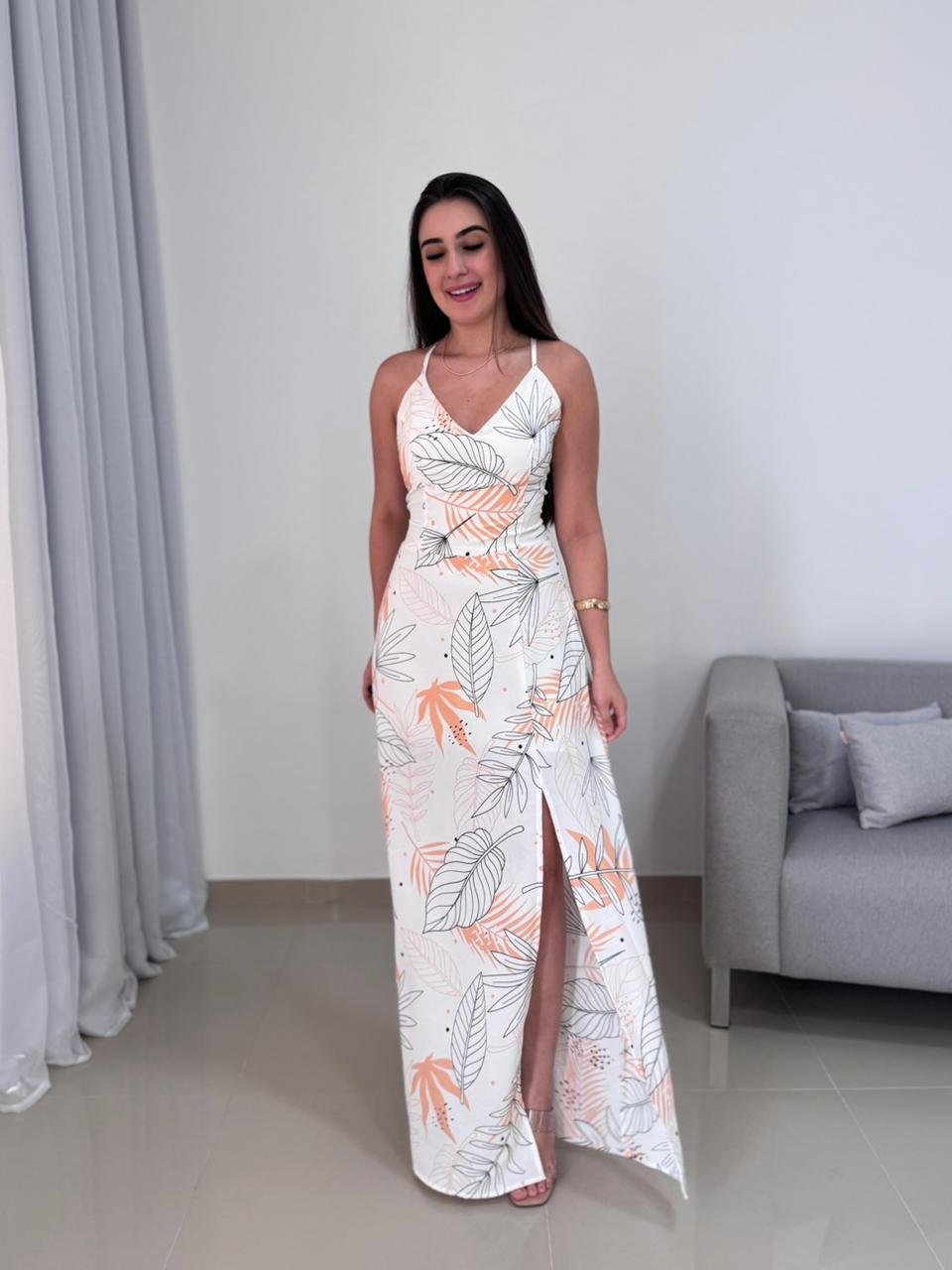 A fenda lateral torna o visual ainda mais interessante: alonga a silhueta e traz conforto ao caminhar, além de equilibrar sensualidade e elegância na medida certa. Seu tecido leve permite total respirabilidade, sendo uma excelente escolha para dias quentes, viagens, passeios, momentos à beira-mar, festas ao ar livre, jantares e produções casuais arrumadas. O fundo claro ilumina o visual e cria contraste sofisticado com o desenho de folhagens, favorecendo diferentes tonalidades de pele e estilos pessoais. Basta combinar com rasteira ou salto delicado, e o look se transforma para qualquer ocasião.