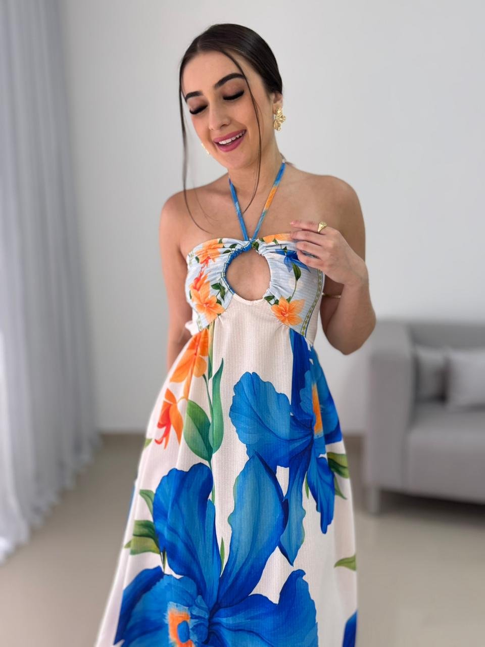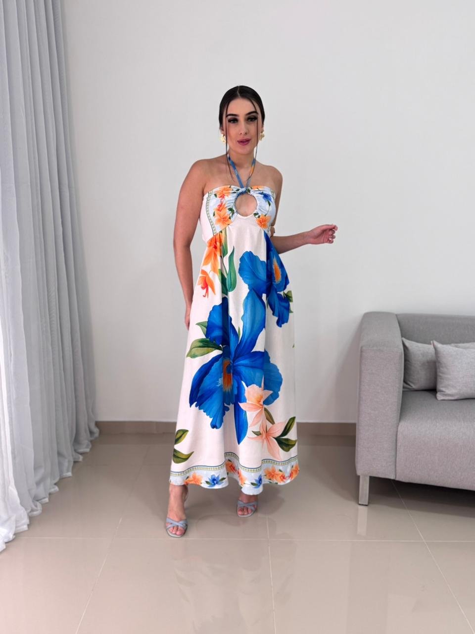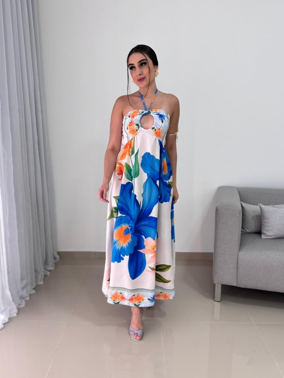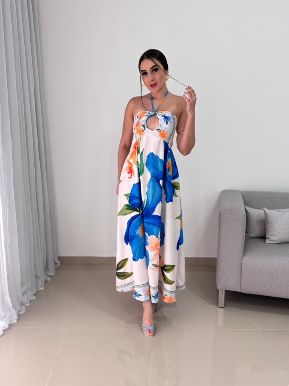 Este vestido longo com estampa tropical é uma peça marcante, leve e extremamente versátil, ideal para compor produções elegantes e frescas nos dias mais quentes. Confeccionado em tecido leve e fluido, ele proporciona excelente caimento, garantindo conforto ao vestir e movimento suave ao caminhar. A combinação das flores em tons vibrantes de azul e laranja cria um visual alegre, sofisticado e perfeito para ocasiões diurnas, passeios, viagens, almoços especiais ou eventos ao ar livre.