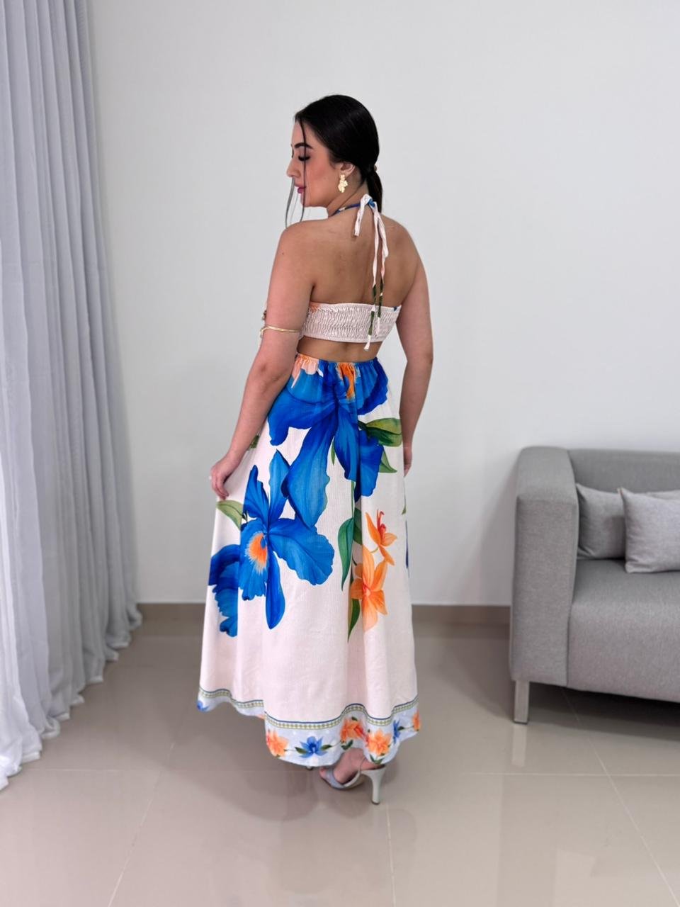 Destaque: o Vestido Longo Tropical Floral Azul e Laranja oferece duas possibilidades de uso — com amarração no pescoço ou como tomara que caia — unindo conforto, elegância e versatilidade em uma única peça.