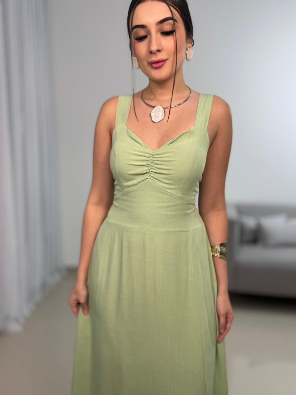 o Vestido Longo Viscolinho Verde Pistache com Bojo combina caimento leve, ajuste confortável e um visual elegante, perfeito para diversas ocasiões.