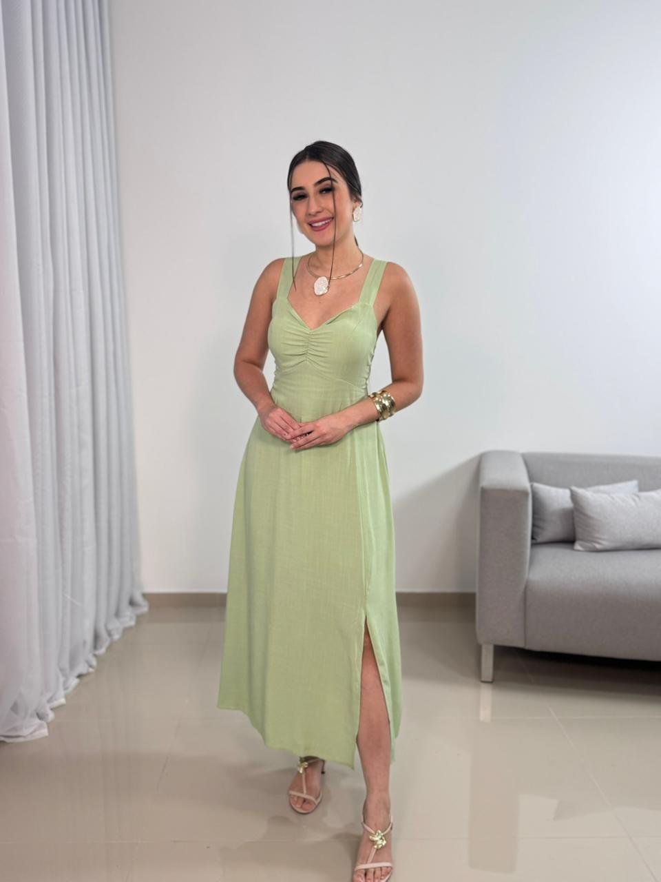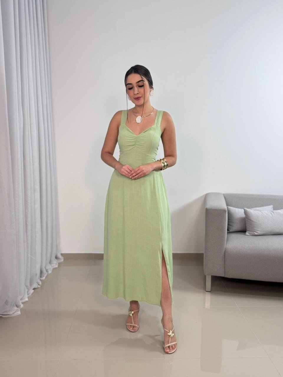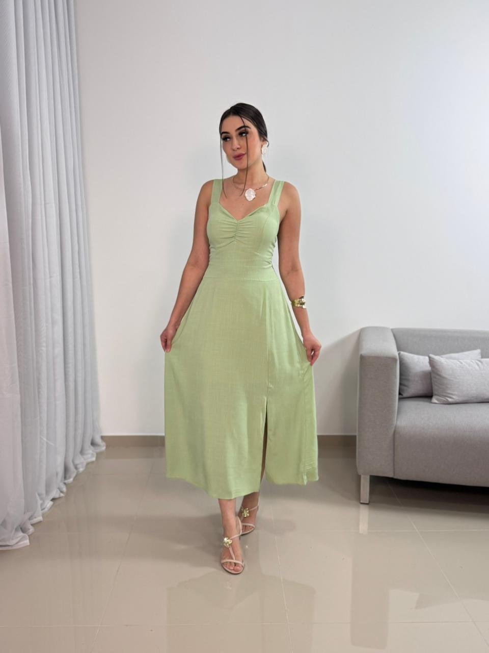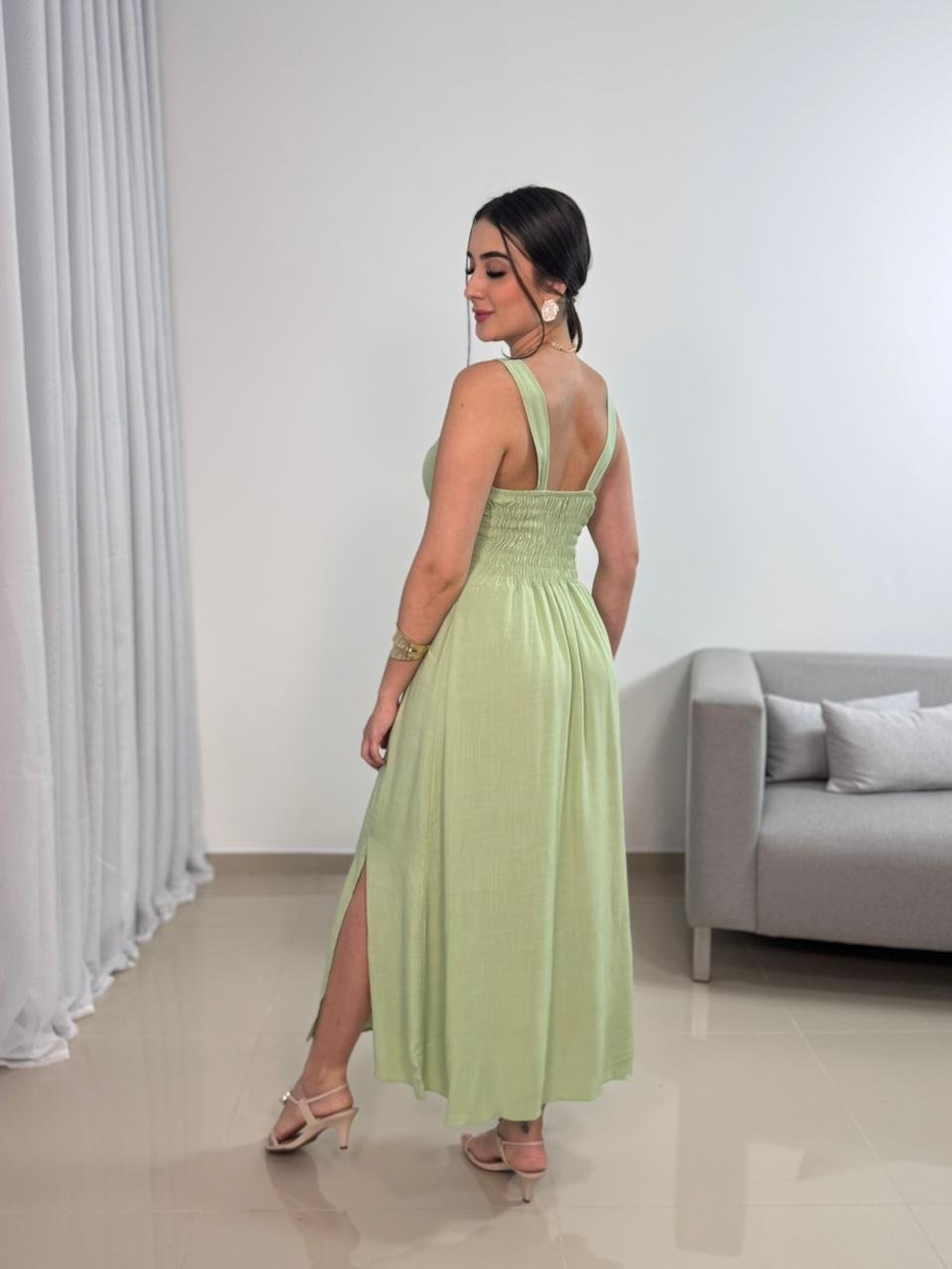 O comprimento longo aliado à fenda frontal discreta proporciona movimento e leve sensualidade, facilitando o caminhar e deixando o visual ainda mais elegante. A tonalidade verde pistache transmite frescor, naturalidade e sofisticação, sendo fácil de combinar com acessórios neutros, dourados ou em tons terrosos.