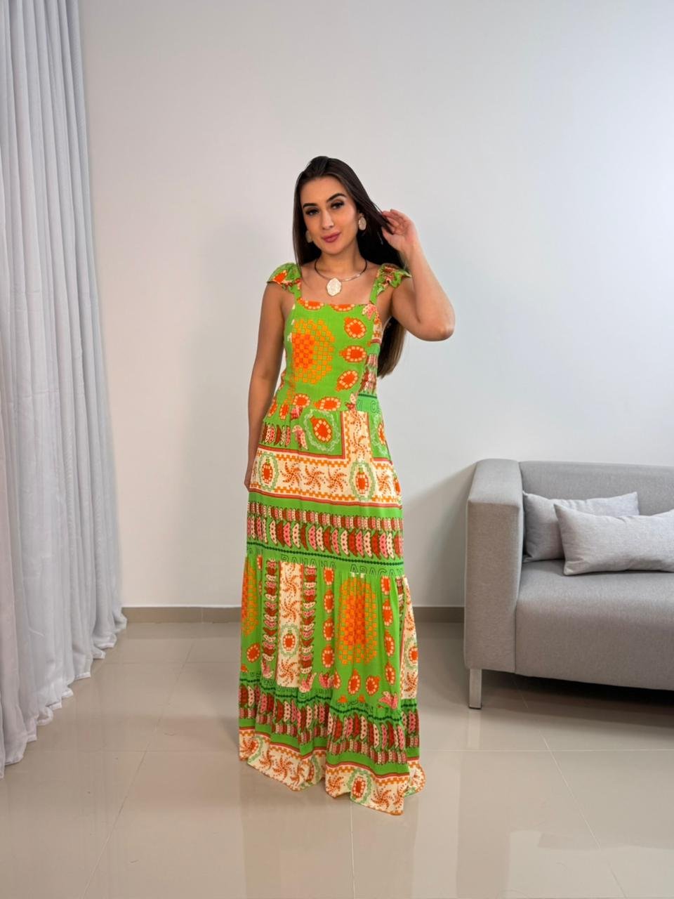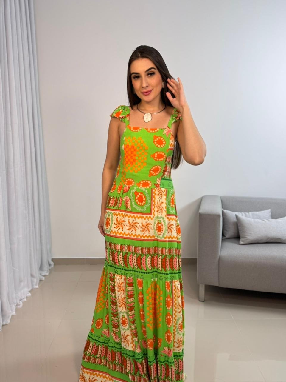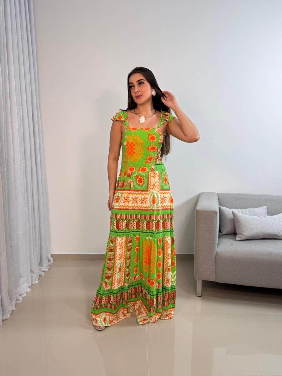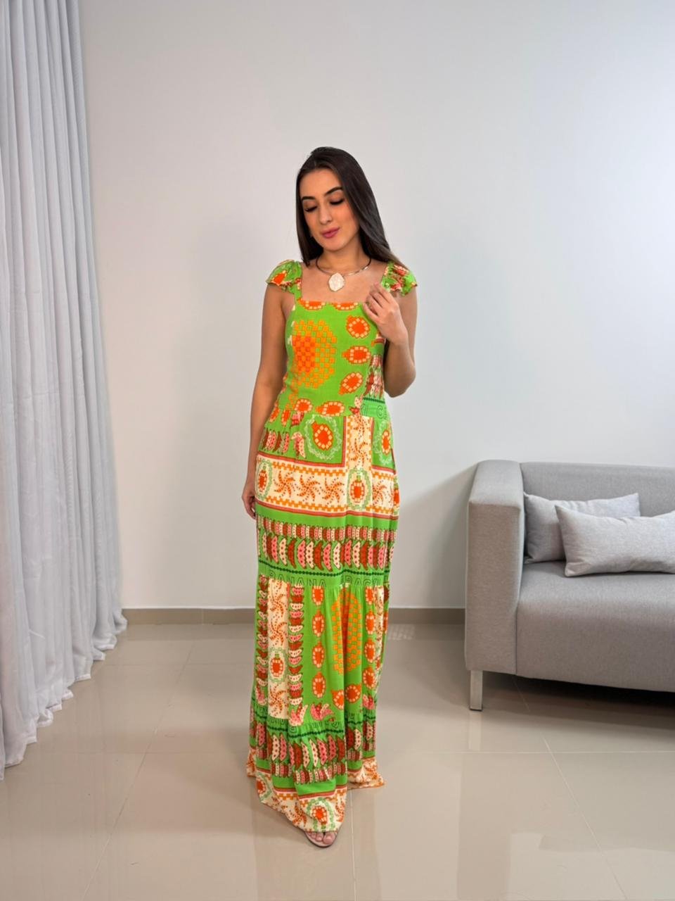 Vestido longo confeccionado em viscolinho, tecido leve, fresco e com toque natural, ideal para quem busca conforto aliado a um visual marcante. O modelo apresenta estampa vibrante em tons de verde e laranja, trazendo personalidade e estilo para produções de verão, viagens e ocasiões ao ar livre. A modelagem longa alonga a silhueta e garante um caimento elegante, com movimento suave ao caminhar.