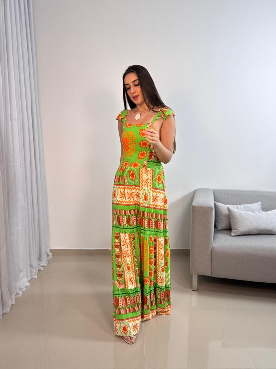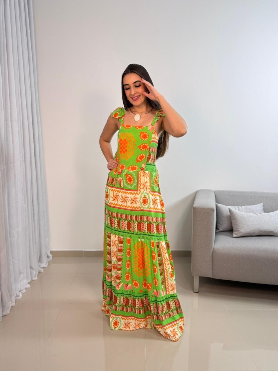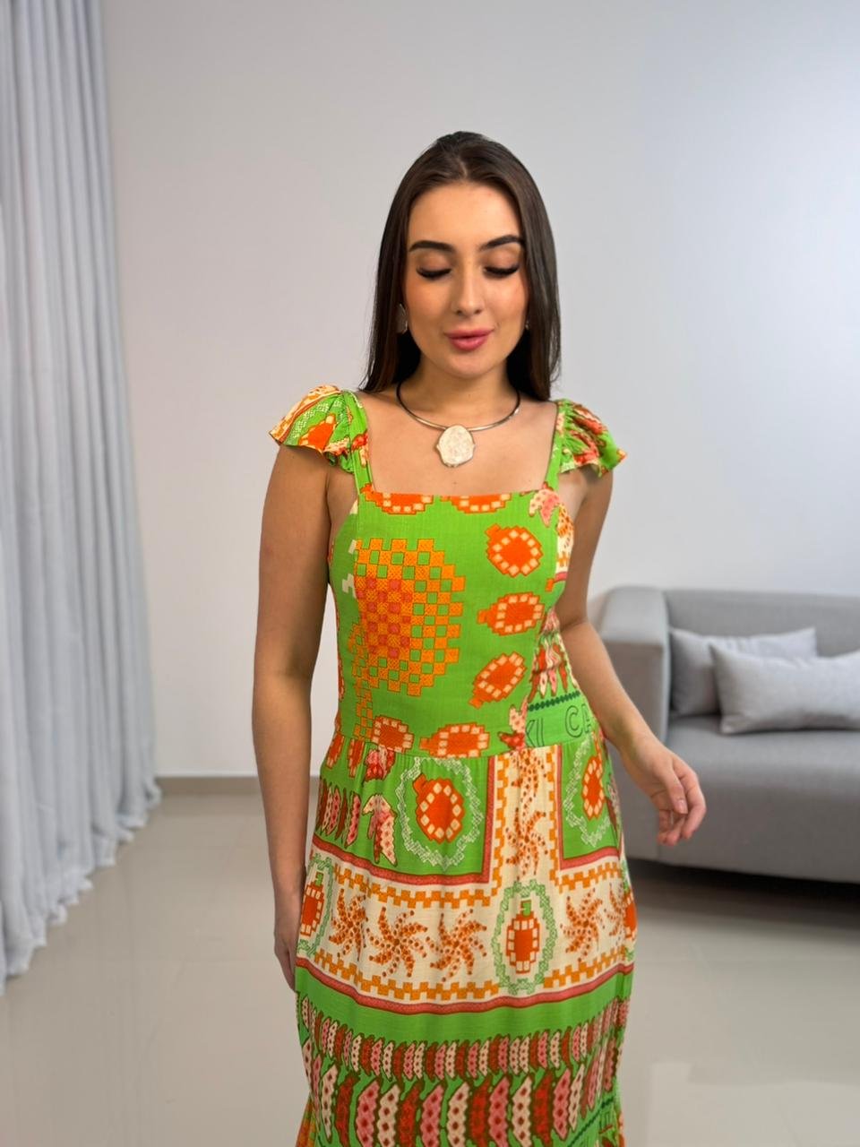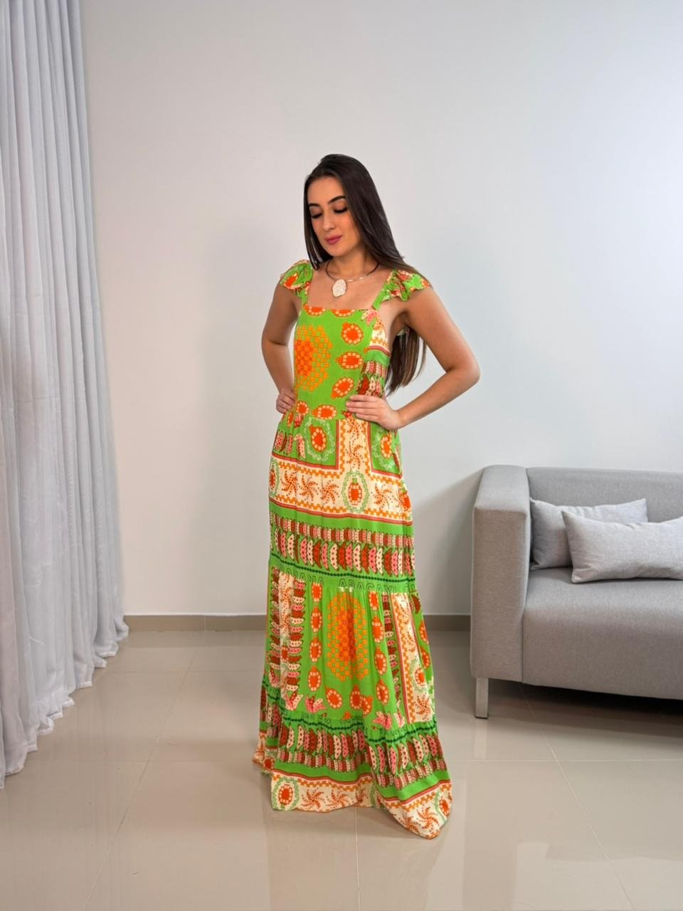 Vestido longo confeccionado em viscolinho, tecido leve, fresco e com toque natural, ideal para quem busca conforto aliado a um visual marcante. O modelo apresenta estampa vibrante em tons de verde e laranja, trazendo personalidade e estilo para produções de verão, viagens e ocasiões ao ar livre. A modelagem longa alonga a silhueta e garante um caimento elegante, com movimento suave ao caminhar.