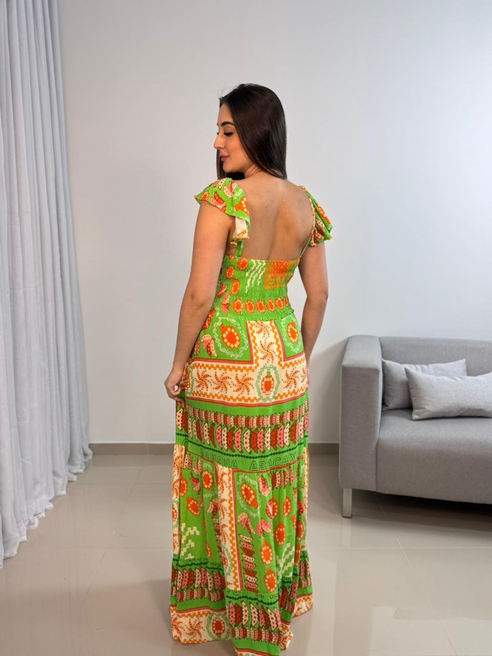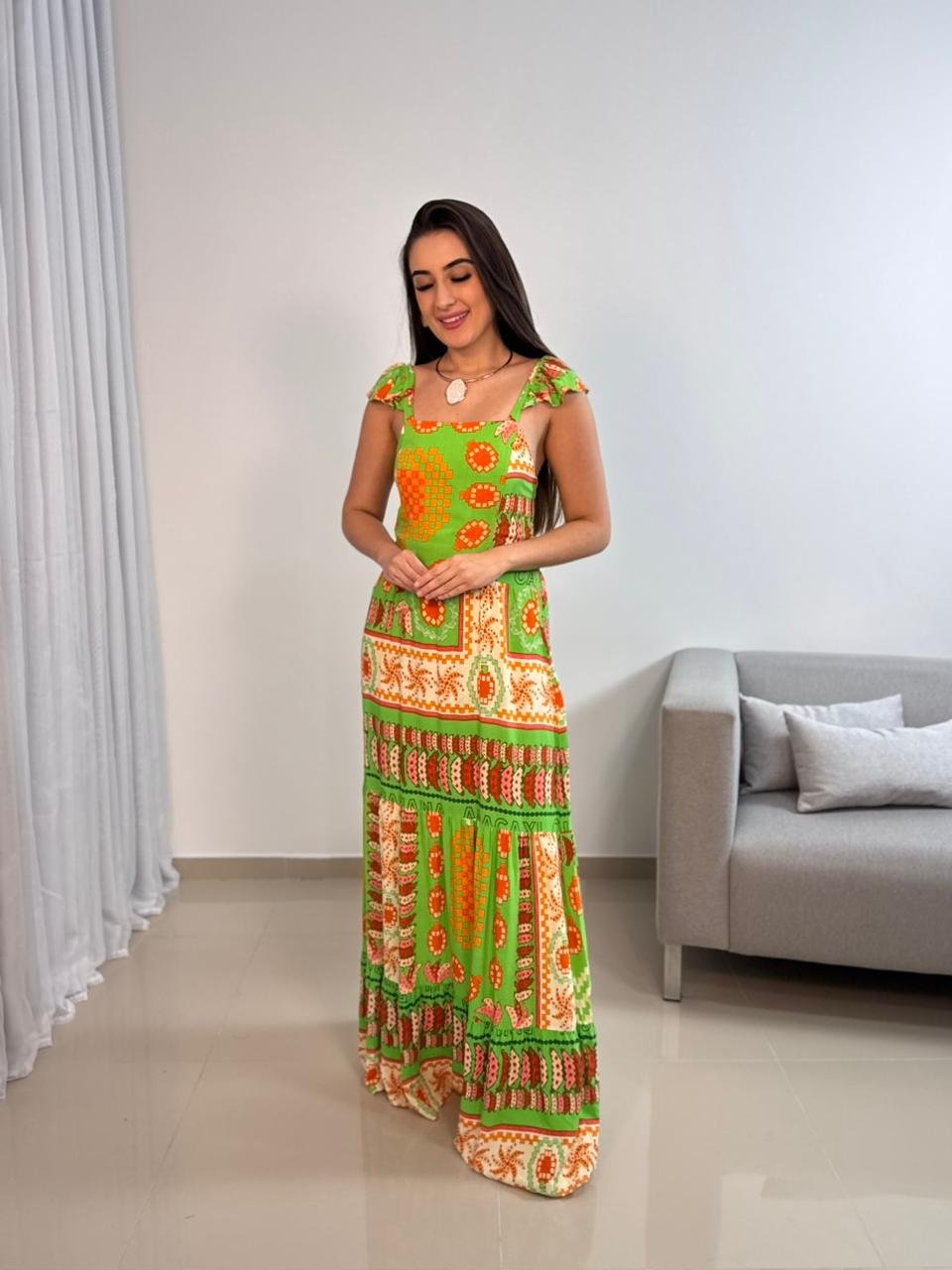 O Vestido Longo Viscolinho Estampado Verde e Laranja se destaca pela estampa exclusiva e pelo lastex nas costas, que garante ajuste perfeito e conforto absoluto.