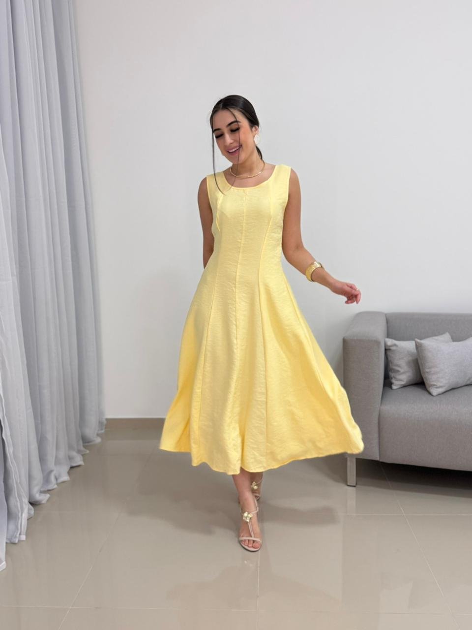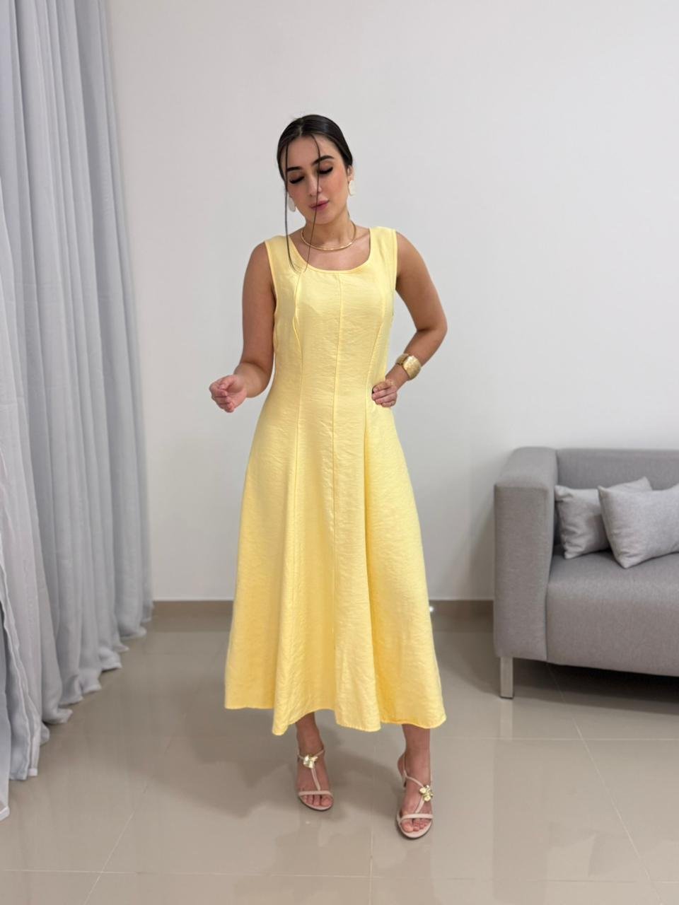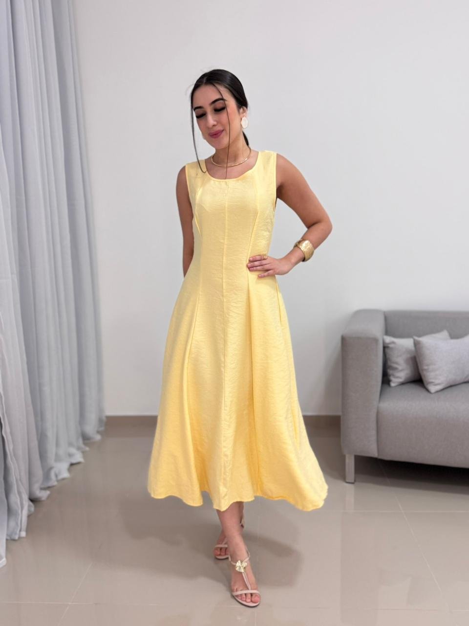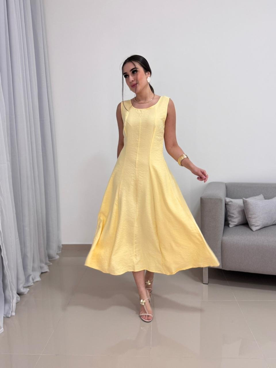 Destaque: o Vestido Midi em Tecido Marrante Amarelo combina conforto, caimento impecável e elegância em uma peça versátil para diversas ocasiões.