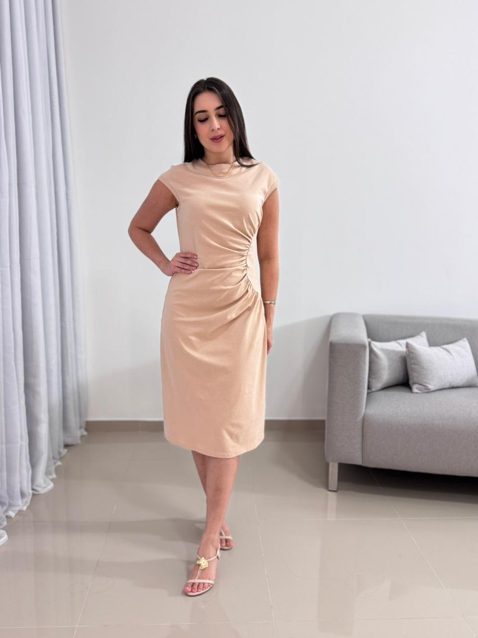 O modelo apresenta drapeado lateral, que valoriza a silhueta de forma estratégica, criando um efeito visual elegante e alongado. Esse detalhe ajuda a disfarçar a região abdominal e realça as curvas com sutileza, tornando o vestido uma opção democrática para diferentes tipos de corpo. O comprimento midi traz sofisticação e versatilidade, permitindo uso tanto em produções casuais quanto em looks mais arrumados.